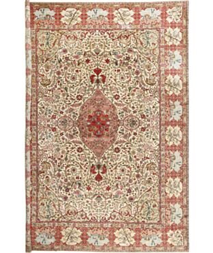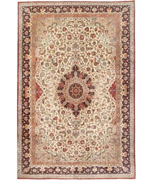 Aus dem nordiranischen Täbris, Hauptstadt der Provinz Ost-Aserbaidschan, stammt dieser Teppich. Die pulsierende Metropole besitzt eine über 500 Jahre alte Knüpftradition: In den alteingesessenen städtischen Manufakturen wurden früher große Teppiche für prächtige Paläste gefertigt. In Täbris begegnen sich verschiedene Kulturen; entsprechend groß ist hier die Vielfalt der Muster und Knüpfqualitäten. Die hochwertigsten Exemplare werden sehr fein geknüpft, mit kurzem Flor aus besonders weicher Wolle; Seidenkonturen betonen die einzelnen Motive.