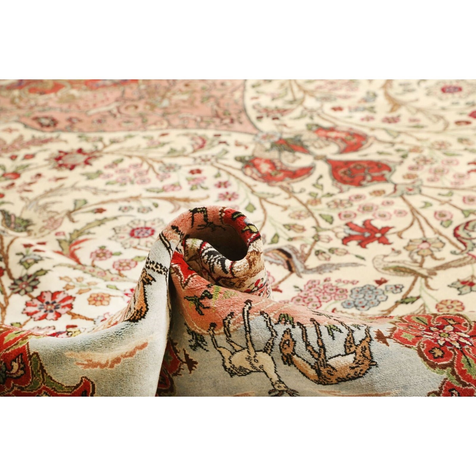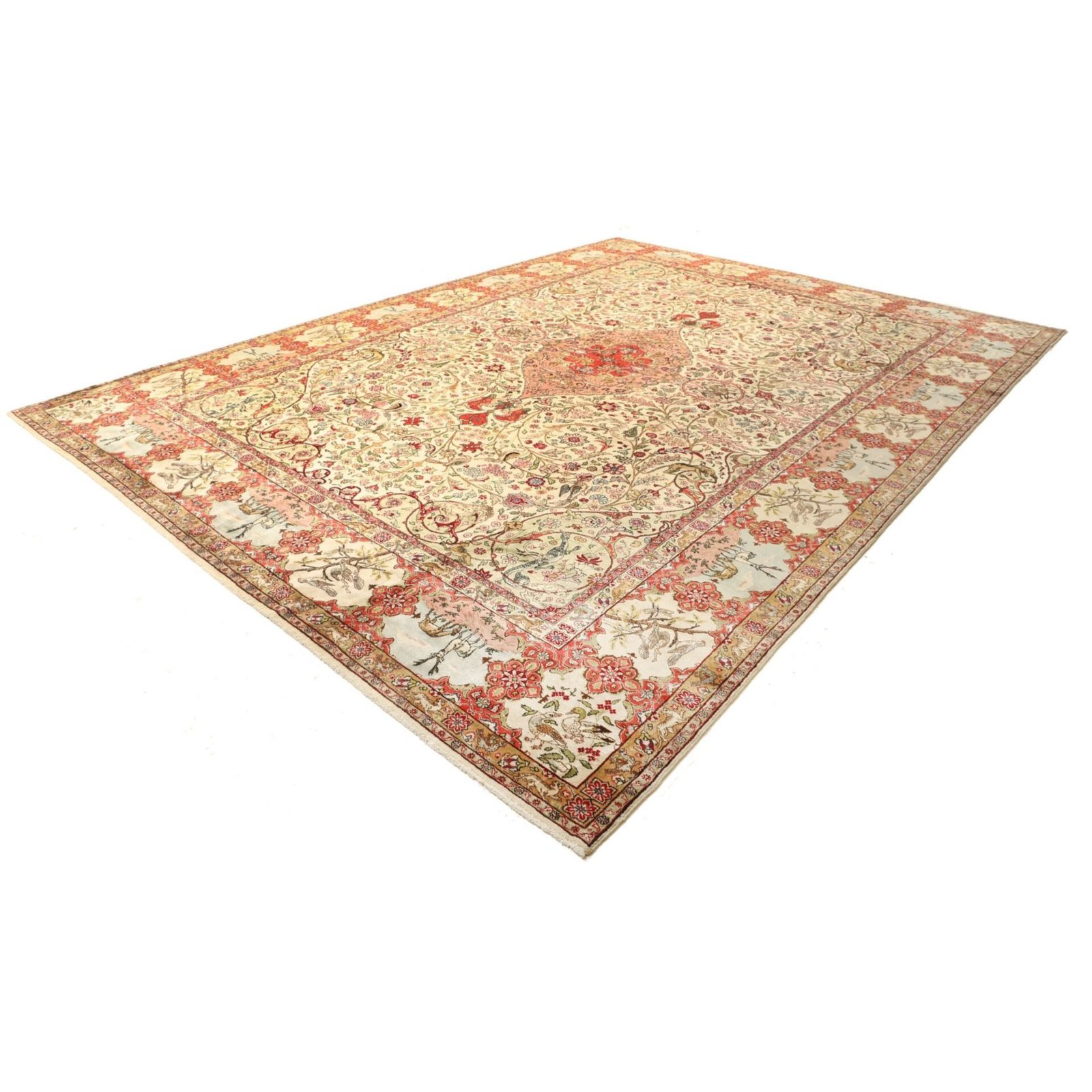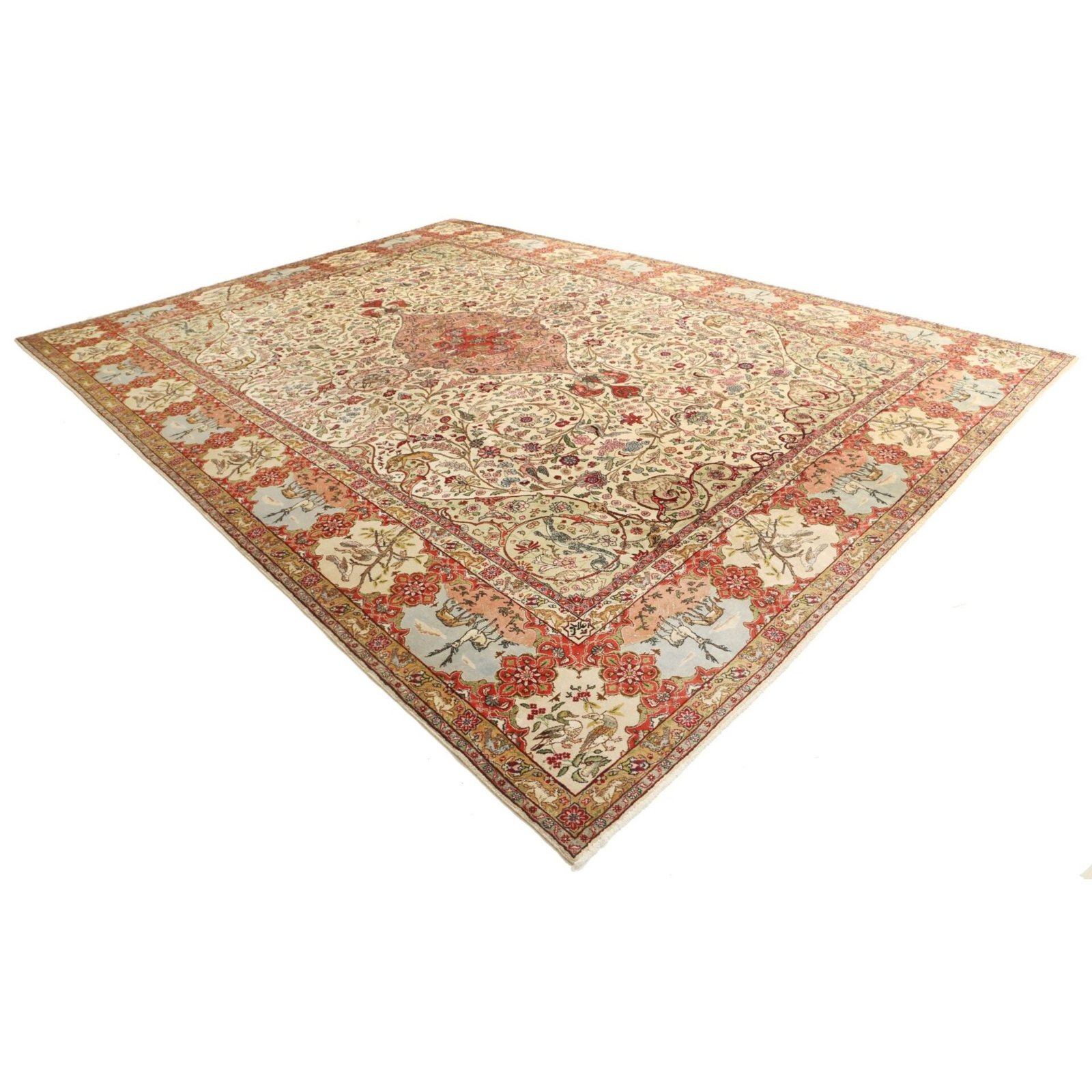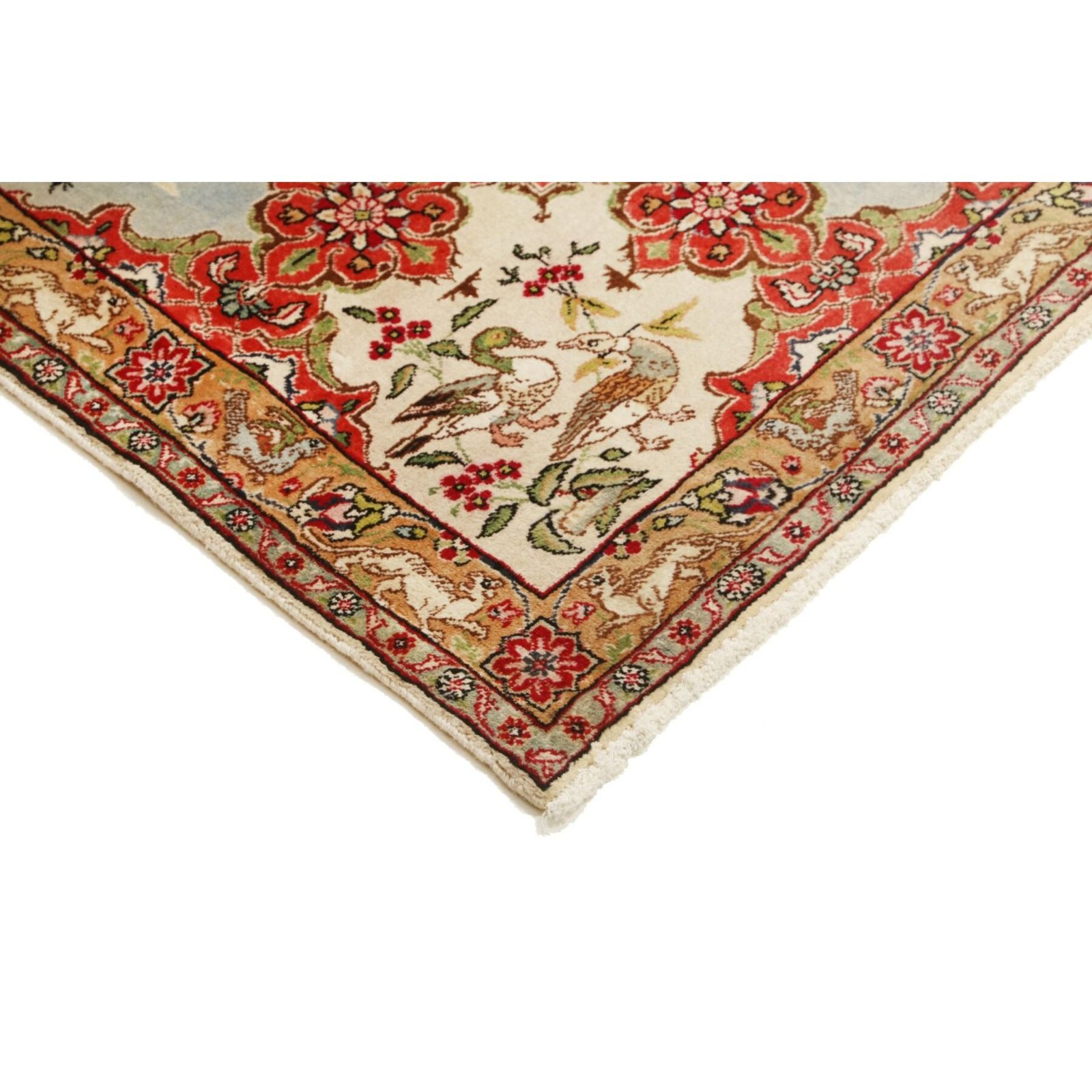 Aus dem nordiranischen Täbris, Hauptstadt der Provinz Ost-Aserbaidschan, stammt dieser Teppich. Die pulsierende Metropole besitzt eine über 500 Jahre alte Knüpftradition: In den alteingesessenen städtischen Manufakturen wurden früher große Teppiche für prächtige Paläste gefertigt. In Täbris begegnen sich verschiedene Kulturen; entsprechend groß ist hier die Vielfalt der Muster und Knüpfqualitäten. Die hochwertigsten Exemplare werden sehr fein geknüpft, mit kurzem Flor aus besonders weicher Wolle; Seidenkonturen betonen die einzelnen Motive.