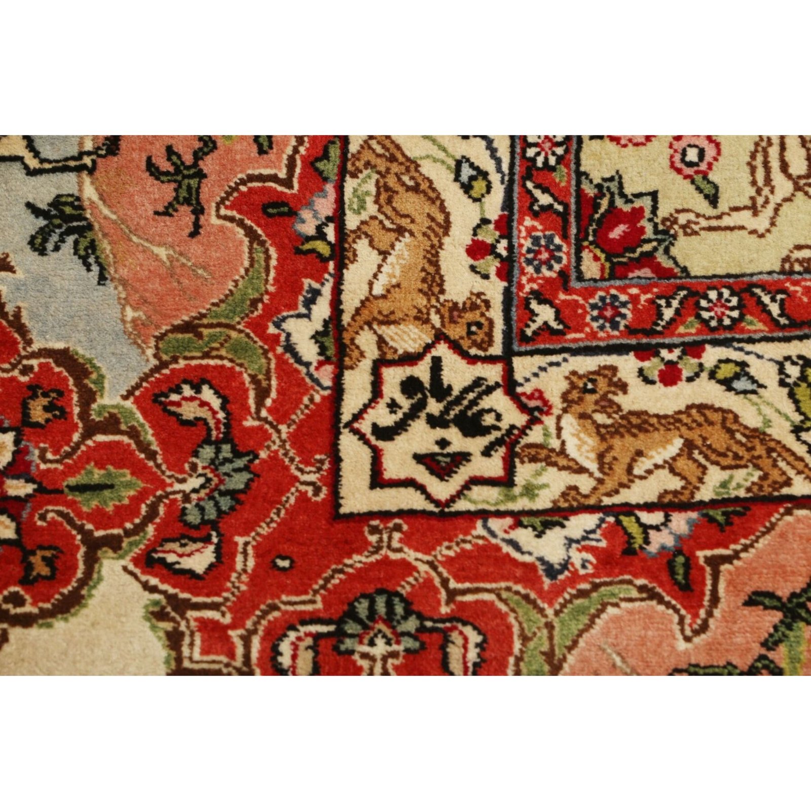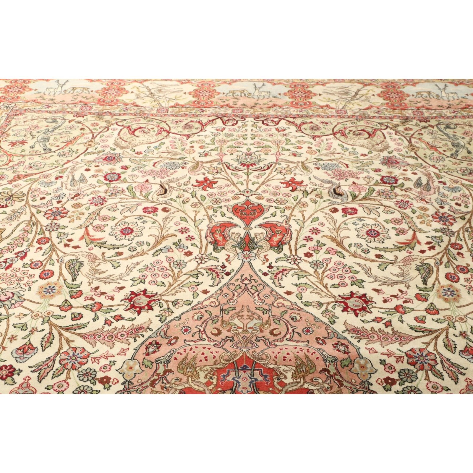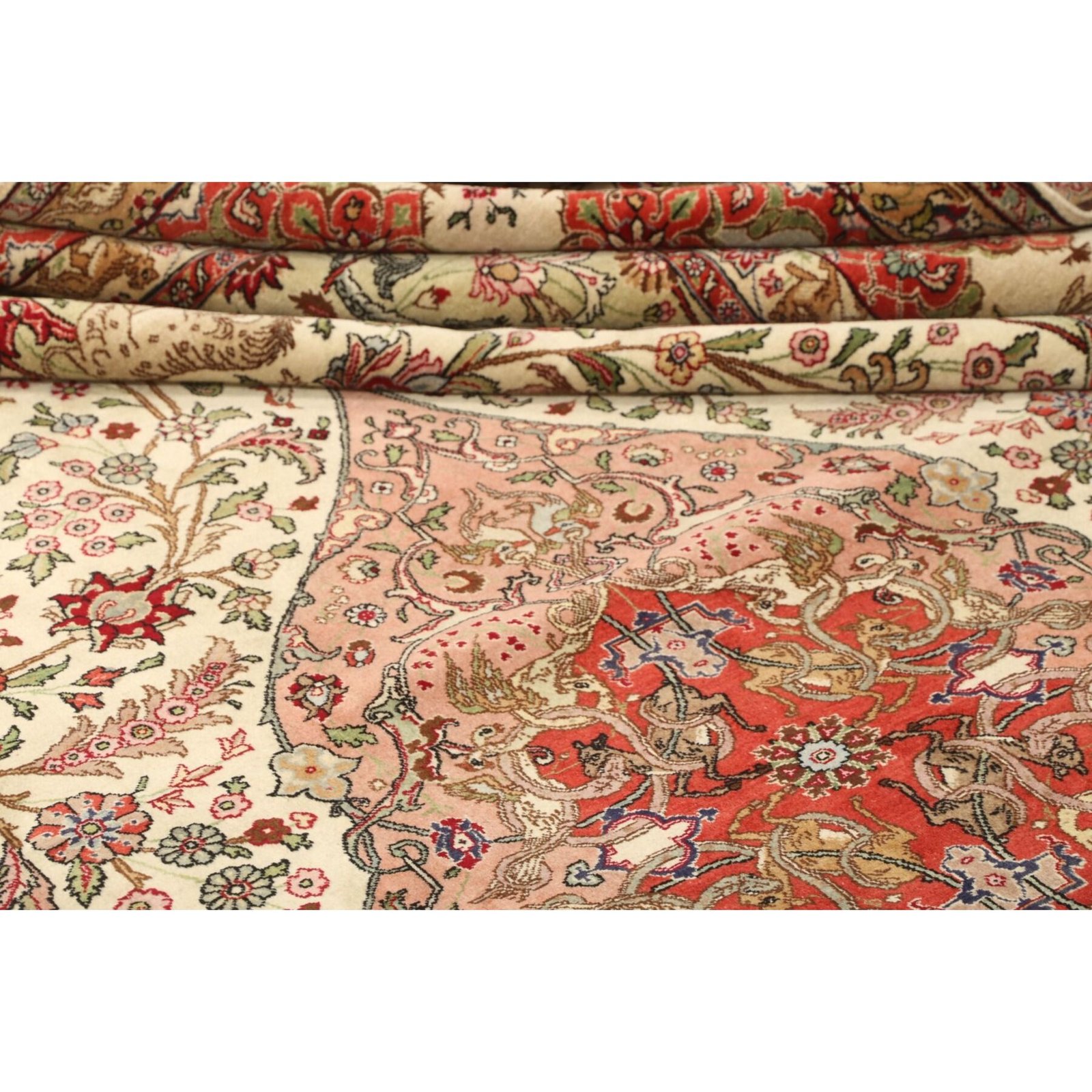 Aus dem nordiranischen Täbris, Hauptstadt der Provinz Ost-Aserbaidschan, stammt dieser Teppich. Die pulsierende Metropole besitzt eine über 500 Jahre alte Knüpftradition: In den alteingesessenen städtischen Manufakturen wurden früher große Teppiche für prächtige Paläste gefertigt. In Täbris begegnen sich verschiedene Kulturen; entsprechend groß ist hier die Vielfalt der Muster und Knüpfqualitäten. Die hochwertigsten Exemplare werden sehr fein geknüpft, mit kurzem Flor aus besonders weicher Wolle; Seidenkonturen betonen die einzelnen Motive.