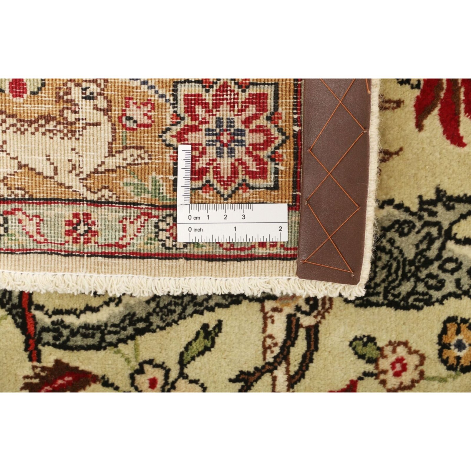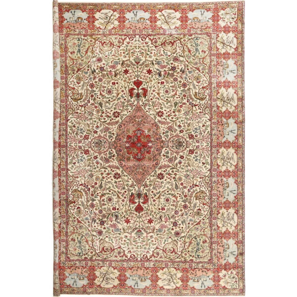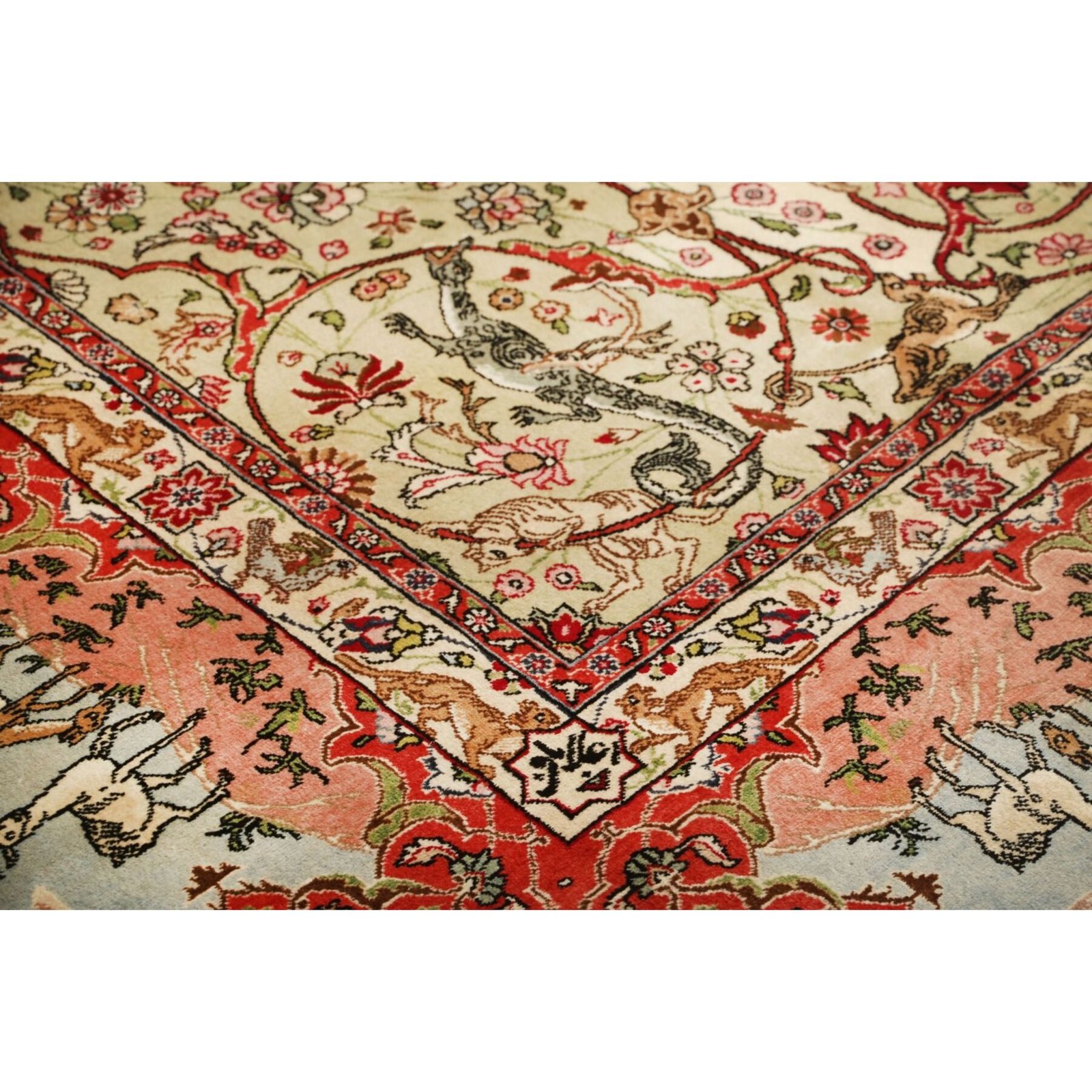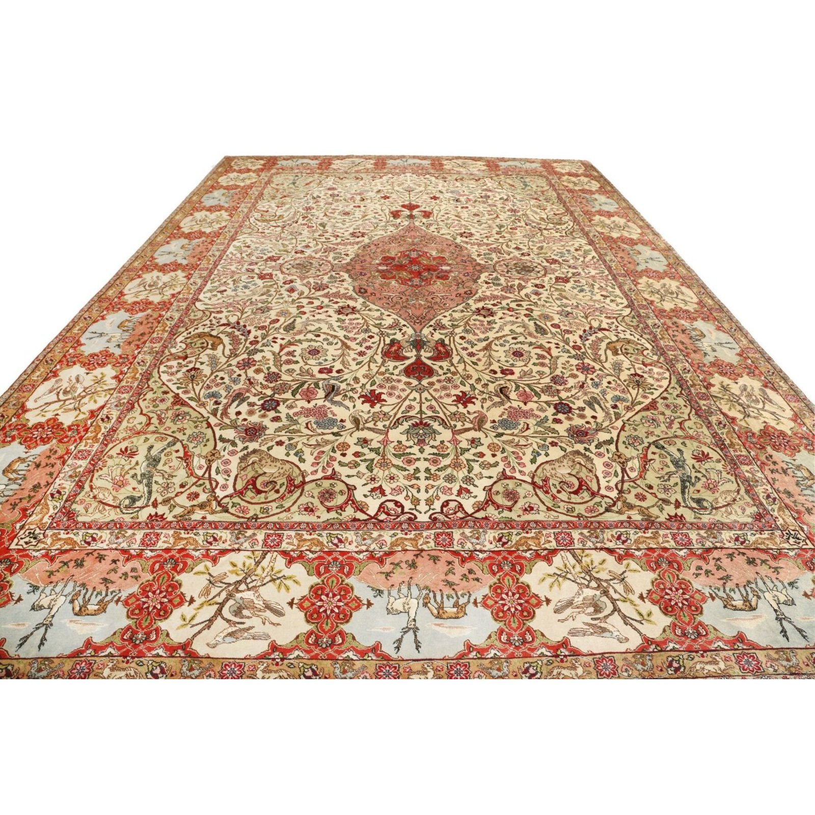 Aus dem nordiranischen Täbris, Hauptstadt der Provinz Ost-Aserbaidschan, stammt dieser Teppich. Die pulsierende Metropole besitzt eine über 500 Jahre alte Knüpftradition: In den alteingesessenen städtischen Manufakturen wurden früher große Teppiche für prächtige Paläste gefertigt. In Täbris begegnen sich verschiedene Kulturen; entsprechend groß ist hier die Vielfalt der Muster und Knüpfqualitäten. Die hochwertigsten Exemplare werden sehr fein geknüpft, mit kurzem Flor aus besonders weicher Wolle; Seidenkonturen betonen die einzelnen Motive.