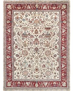 Aus dem nordiranischen Täbris, Hauptstadt der Provinz Ost-Aserbaidschan, stammt dieser Teppich. Die pulsierende Metropole besitzt eine über 500 Jahre alte Knüpftradition: In den alteingesessenen städtischen Manufakturen wurden früher große Teppiche für prächtige Paläste gefertigt. In Täbris begegnen sich verschiedene Kulturen; entsprechend groß ist hier die Vielfalt der Muster und Knüpfqualitäten. Die hochwertigsten Exemplare werden sehr fein geknüpft, mit kurzem Flor aus besonders weicher Wolle; Seidenkonturen betonen die einzelnen Motive.