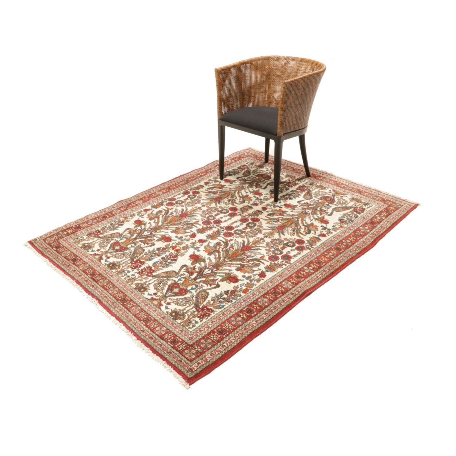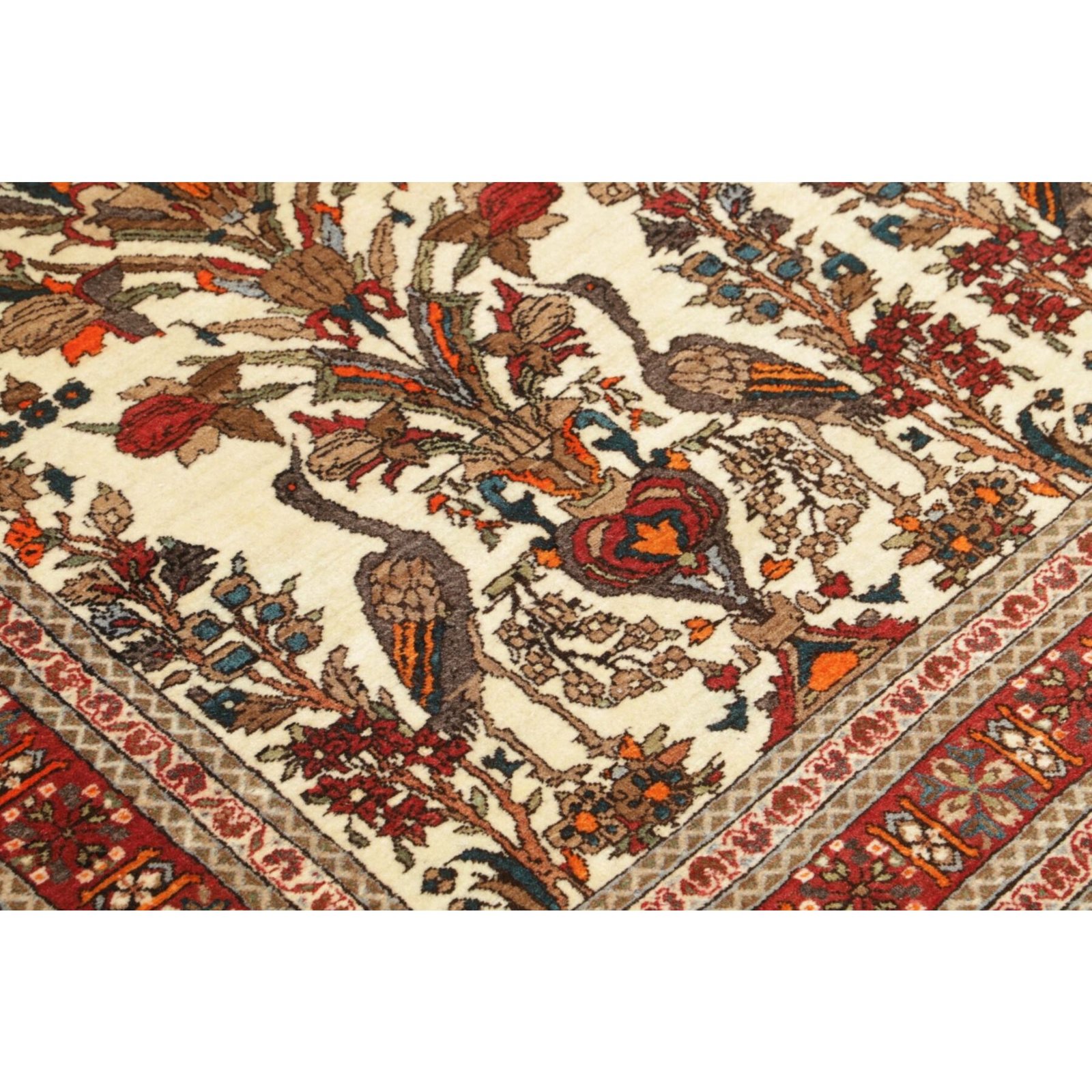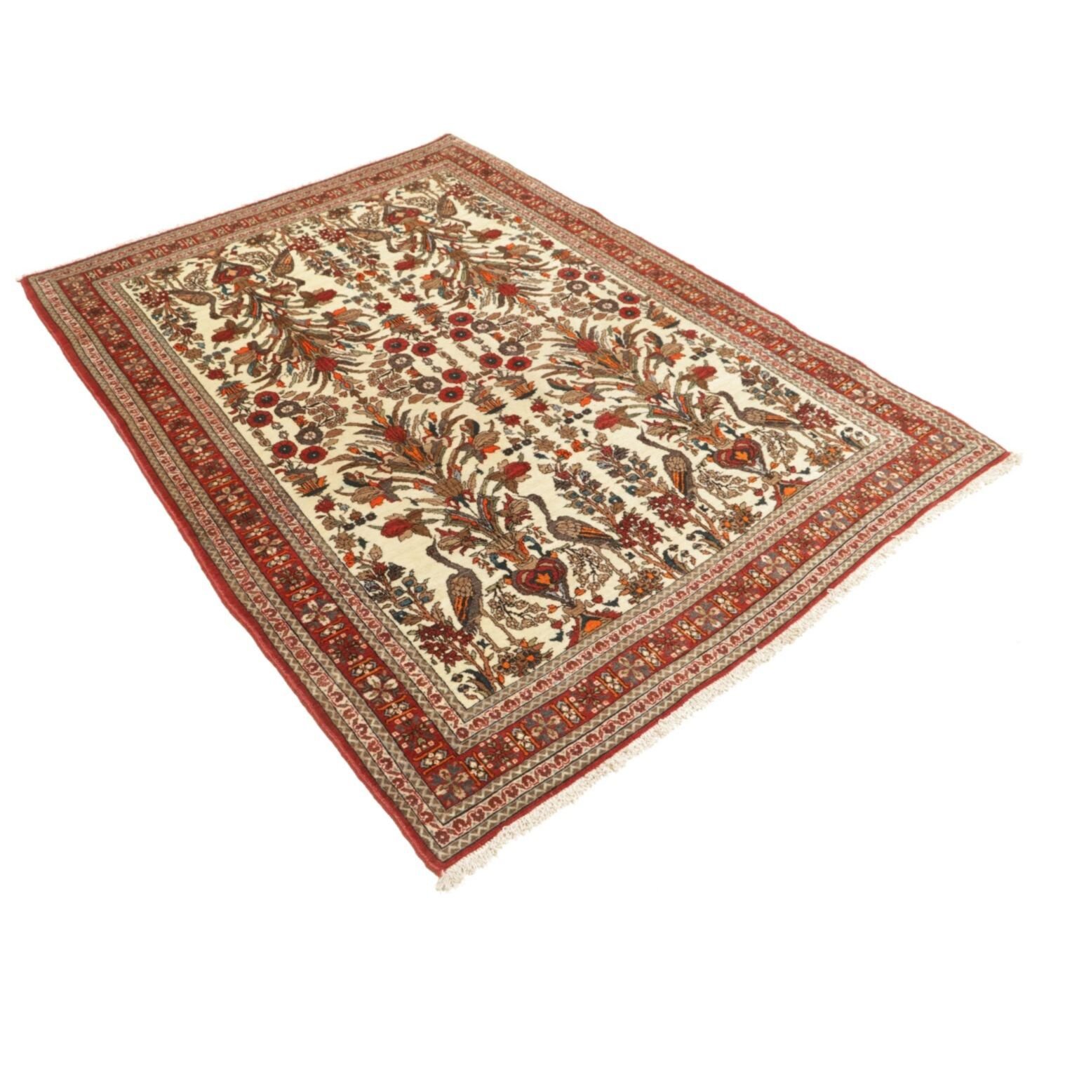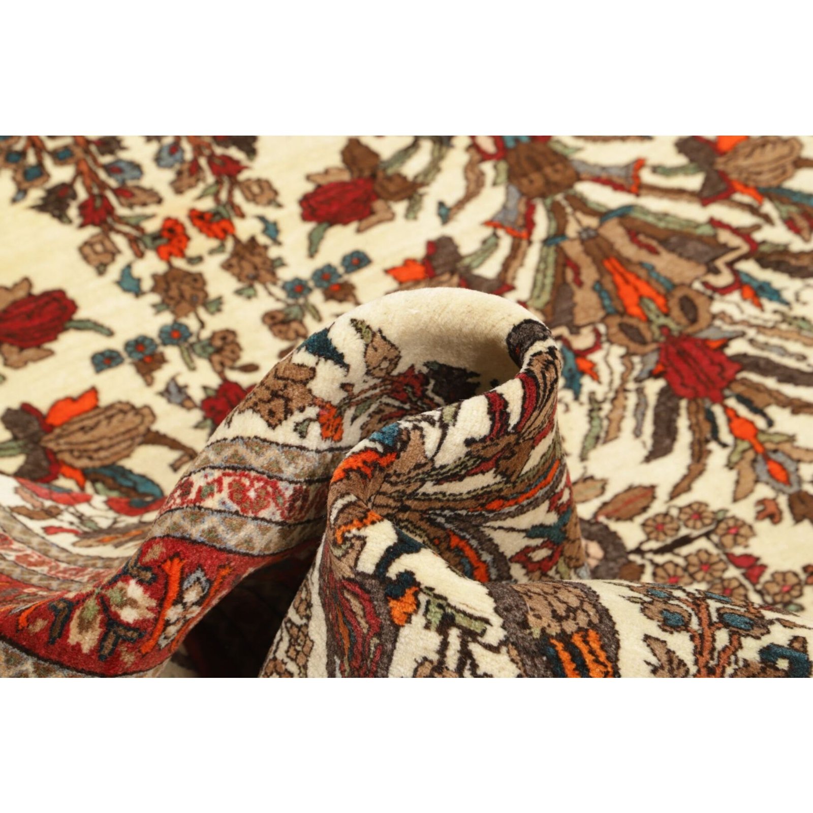 Diese Teppiche aus dem Iran sind handgeknüpft, normalerweise mit asymmetrischen Knoten bis zu einer Dichte von ca. 250.000 bis 380.000 Knoten pro Qm. Die Kette und Schussstruktur besteht aus Baumwolle. Der Flor, der Teppiche besteht aus sehr feiner Schurwolle.