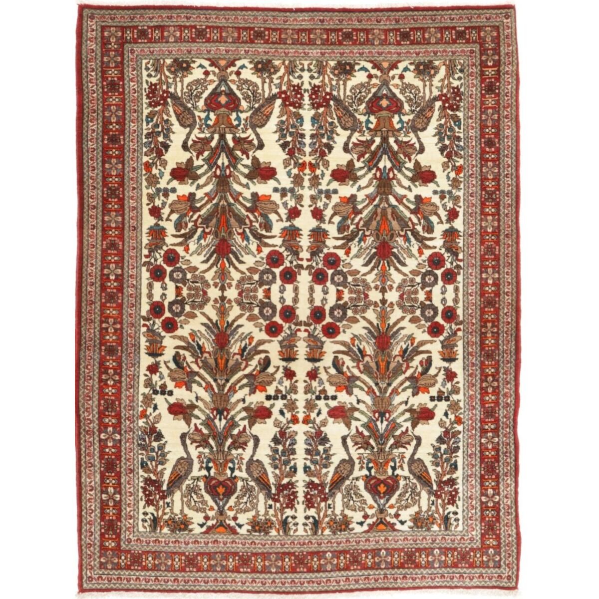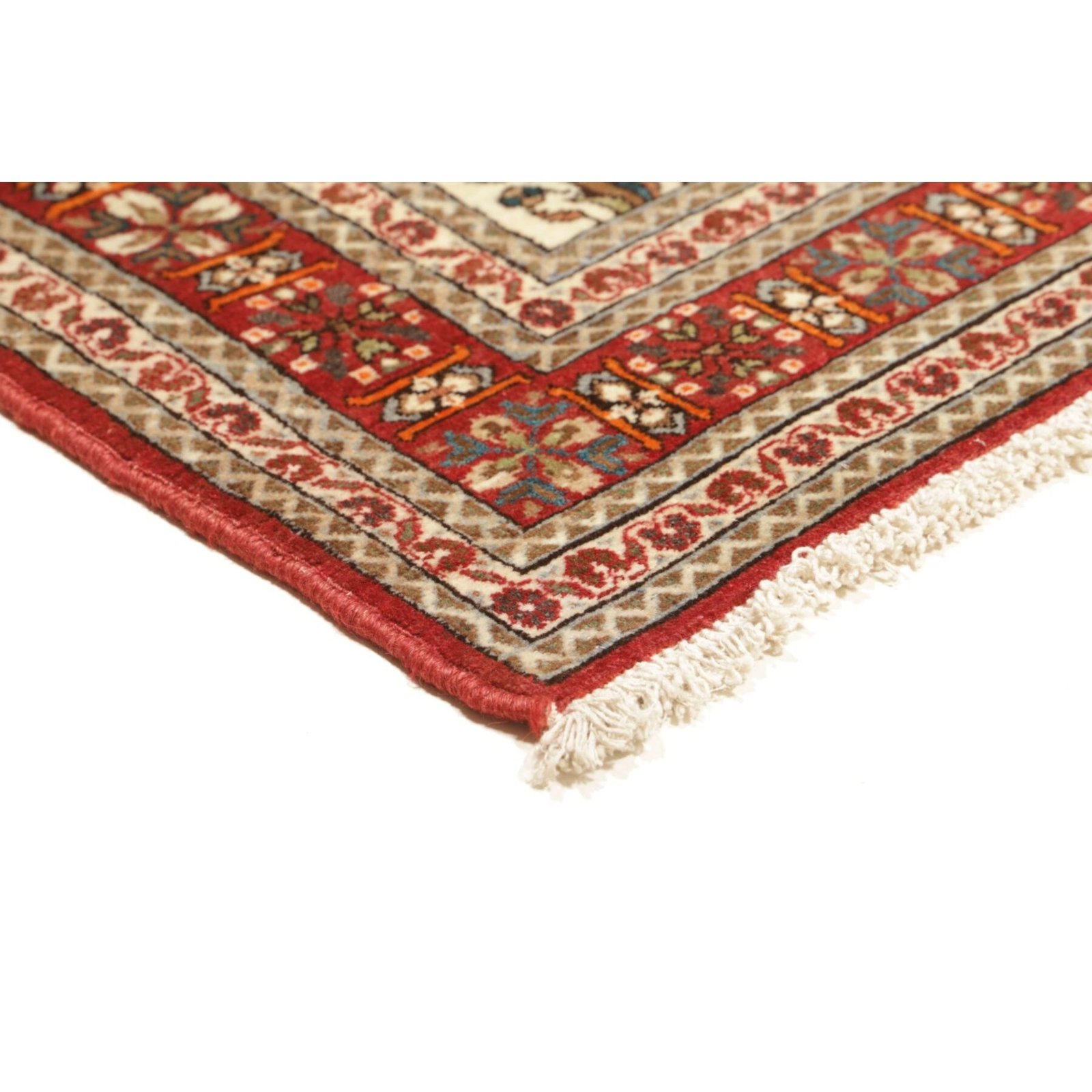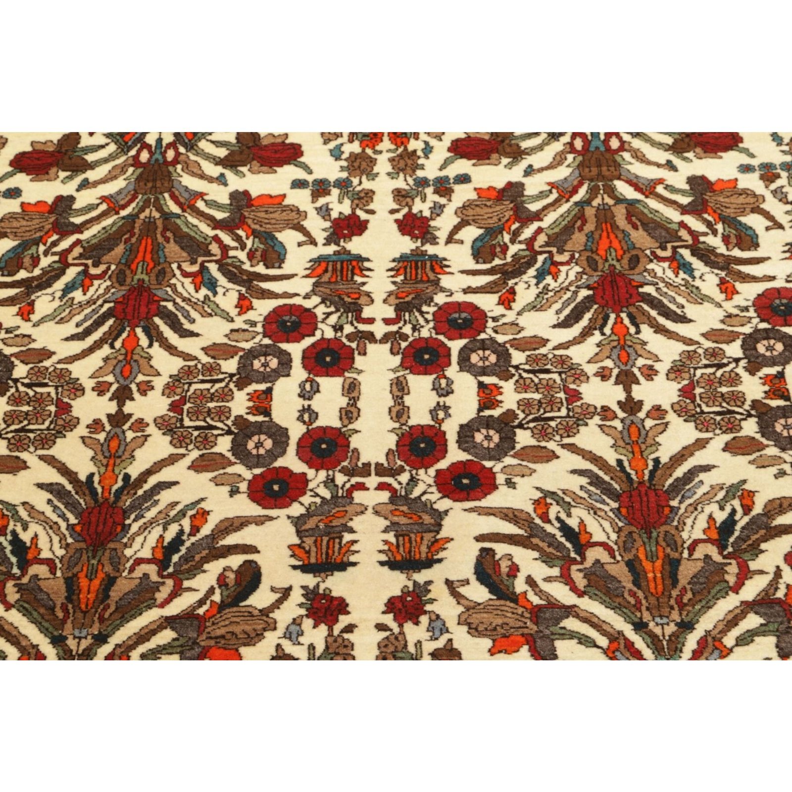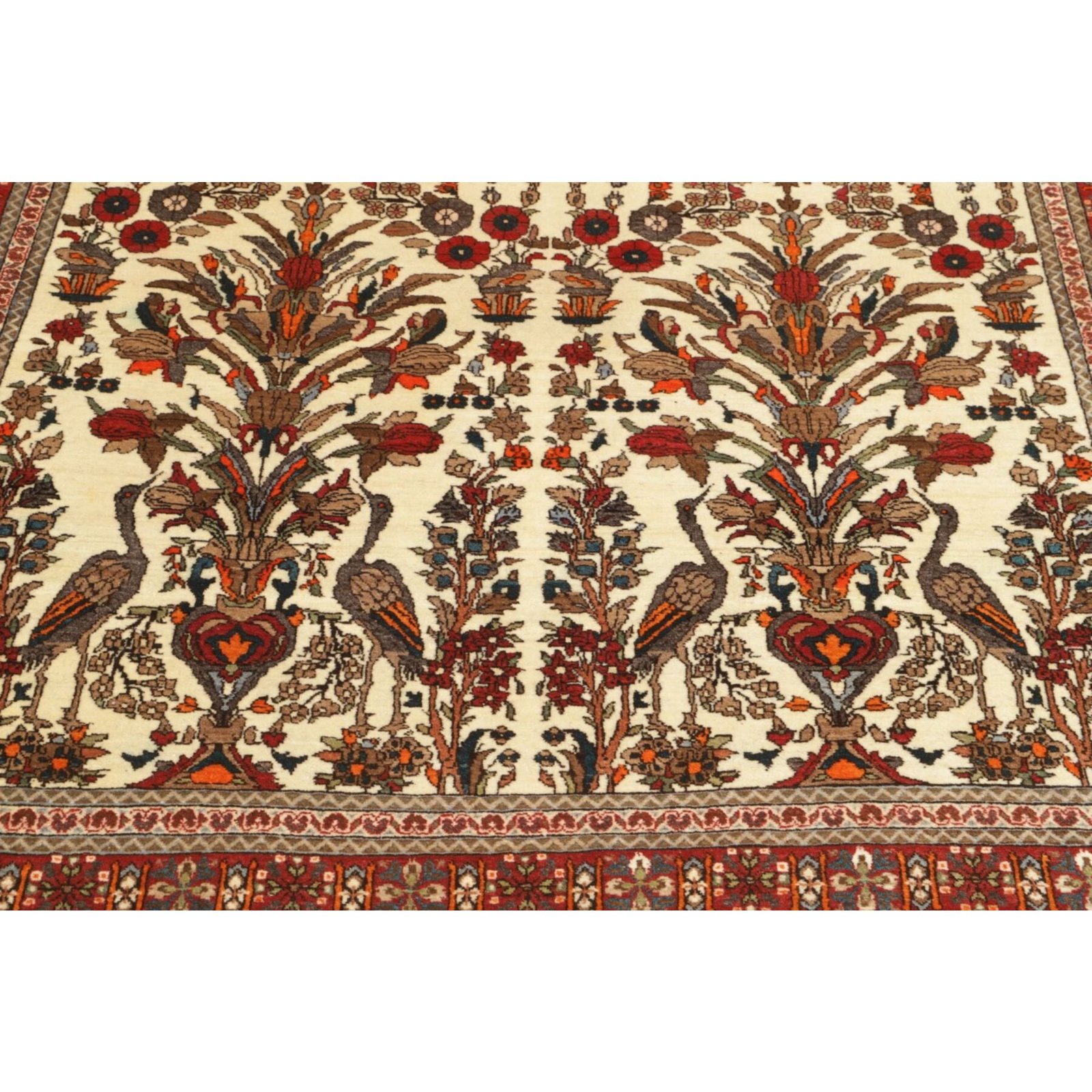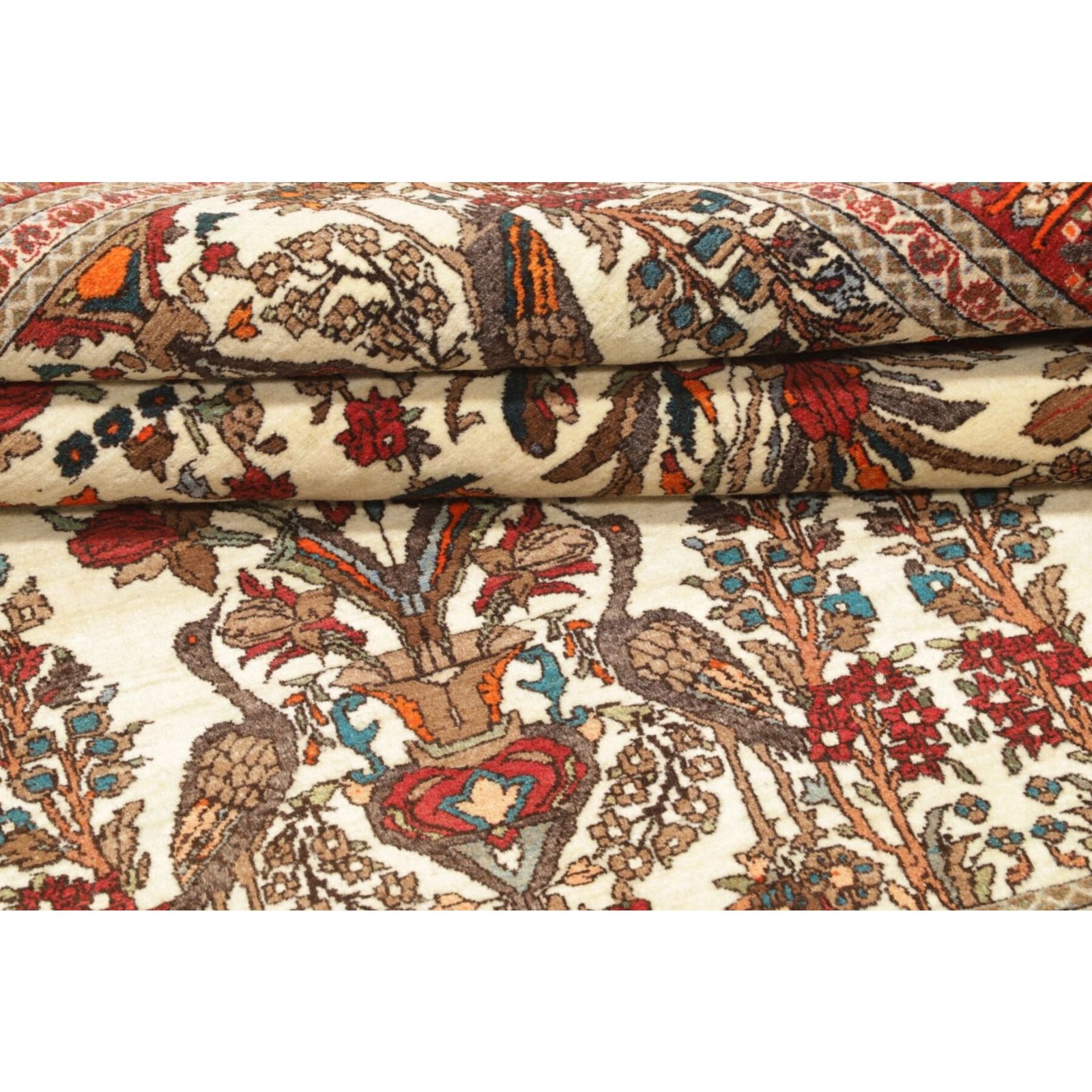 Diese Teppiche aus dem Iran sind handgeknüpft, normalerweise mit asymmetrischen Knoten bis zu einer Dichte von ca. 250.000 bis 380.000 Knoten pro Qm. Die Kette und Schussstruktur besteht aus Baumwolle. Der Flor, der Teppiche besteht aus sehr feiner Schurwolle.