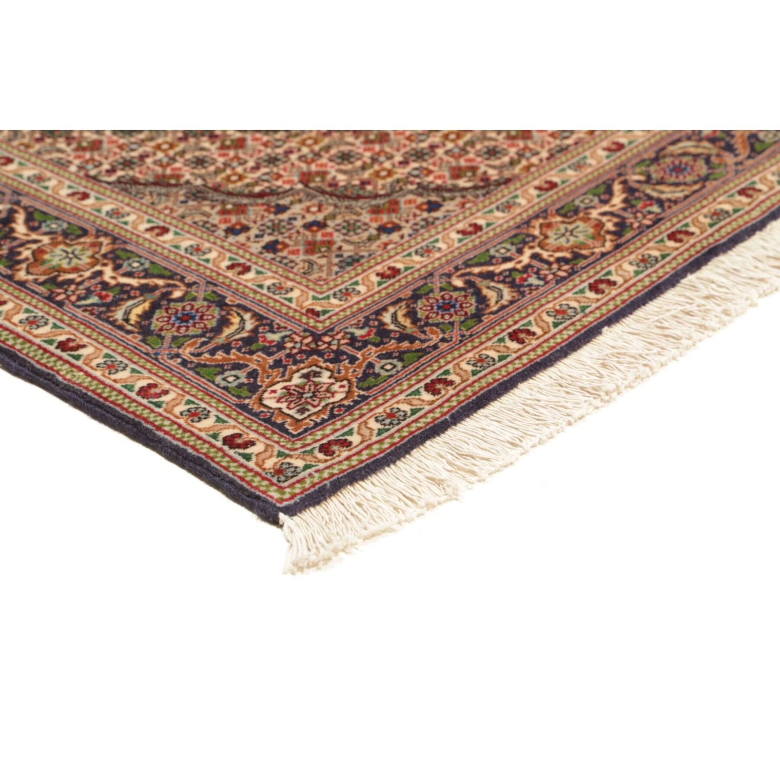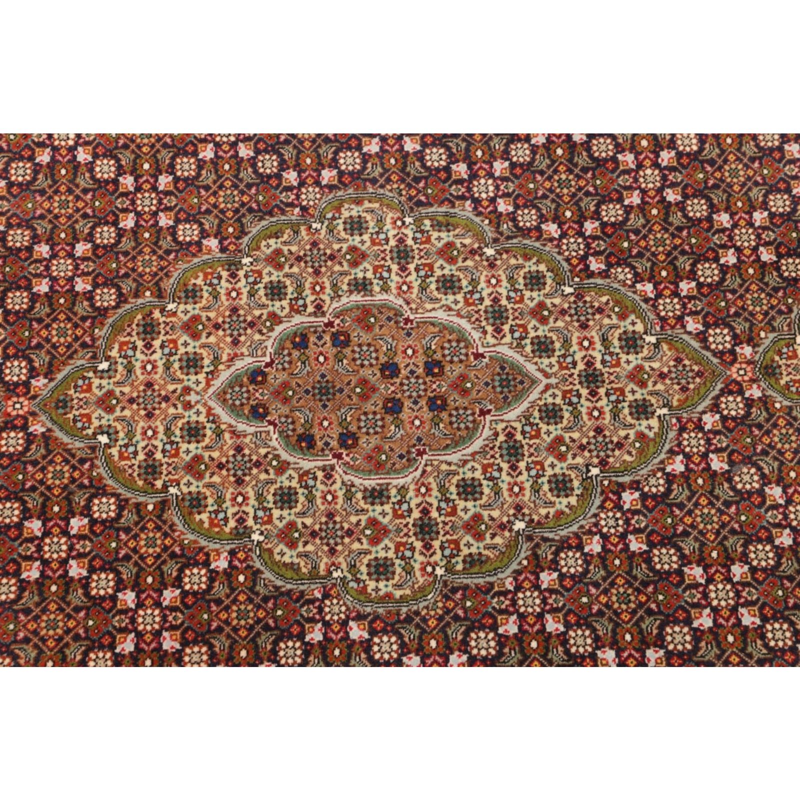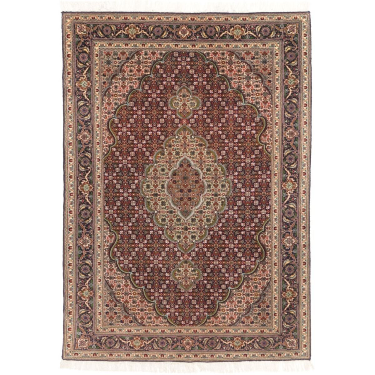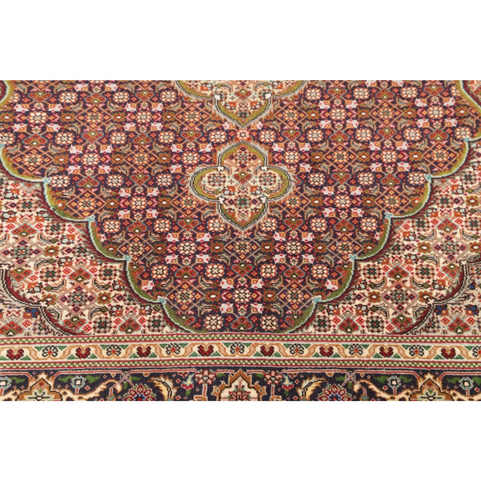 Aus dem nordiranischen Täbris, Hauptstadt der Provinz Ost-Aserbaidschan, stammt dieser Teppich. Die pulsierende Metropole besitzt eine über 500 Jahre alte Knüpftradition: In den alteingesessenen städtischen Manufakturen wurden früher große Teppiche für prächtige Paläste gefertigt. In Täbris begegnen sich verschiedene Kulturen; entsprechend groß ist hier die Vielfalt der Muster und Knüpfqualitäten. Die hochwertigsten Exemplare werden sehr fein geknüpft, mit kurzem Flor aus besonders weicher Wolle; Seidenkonturen betonen die einzelnen Motive.