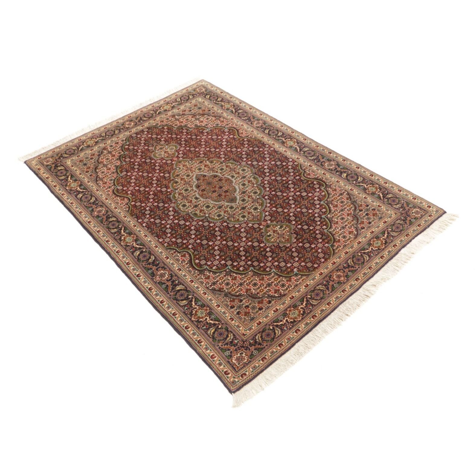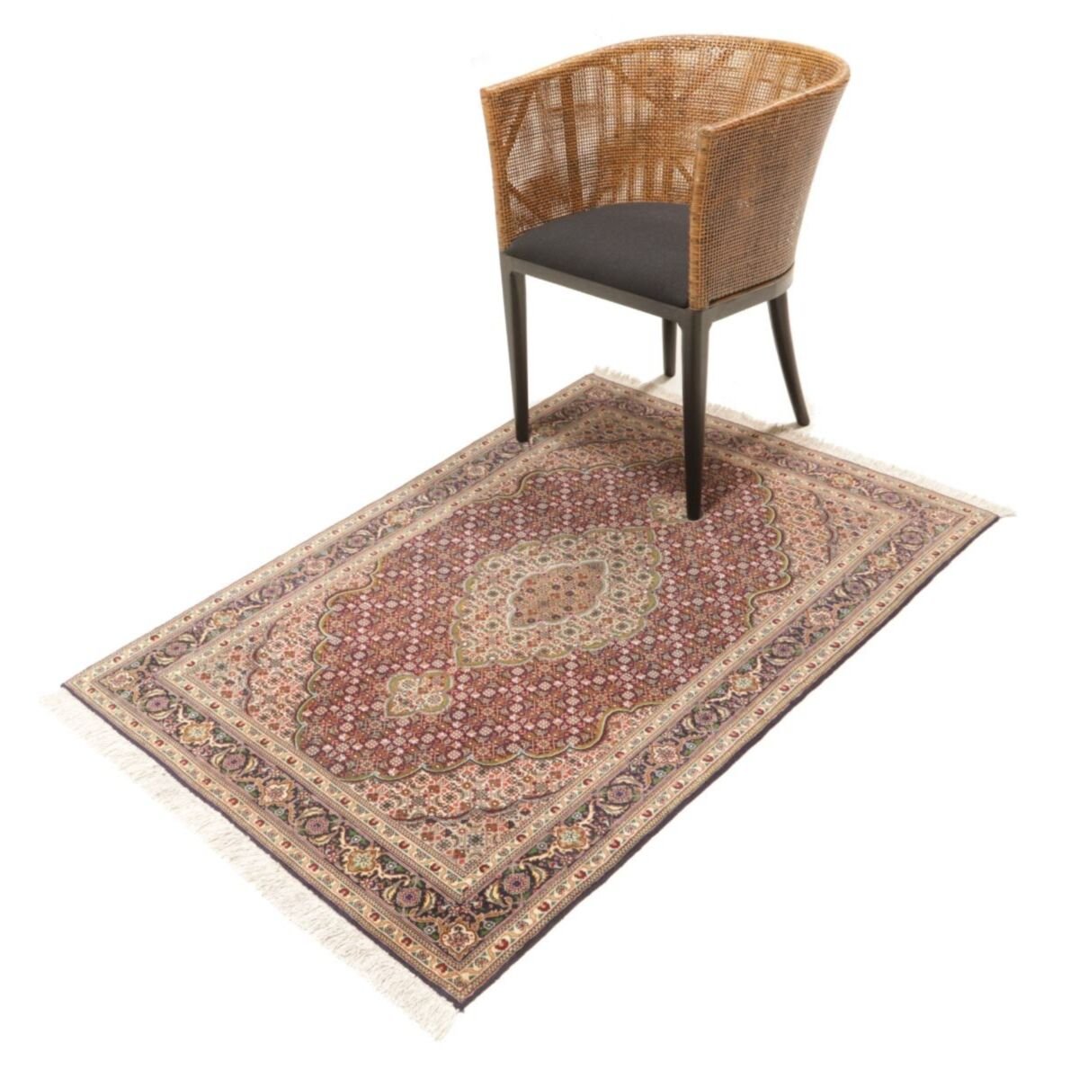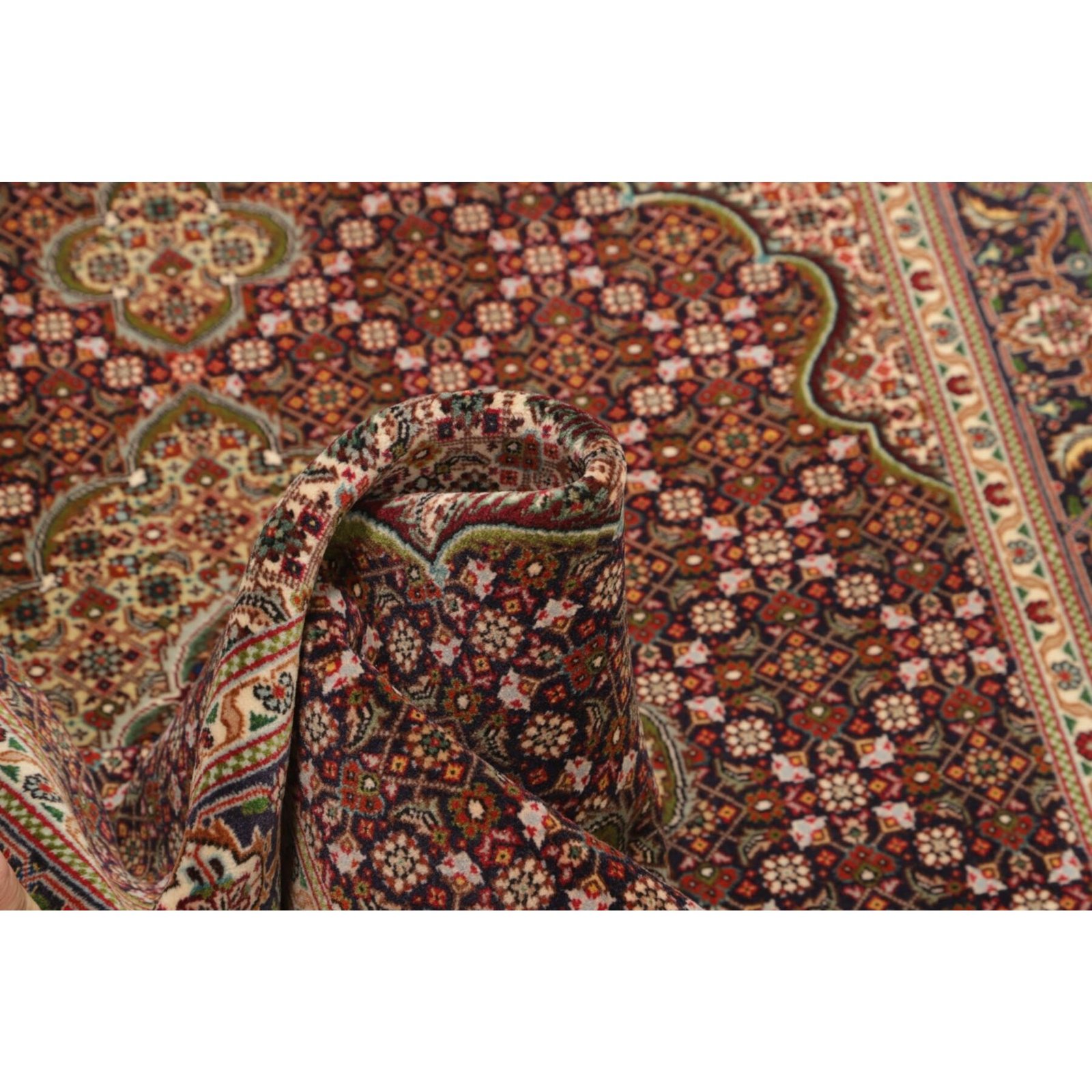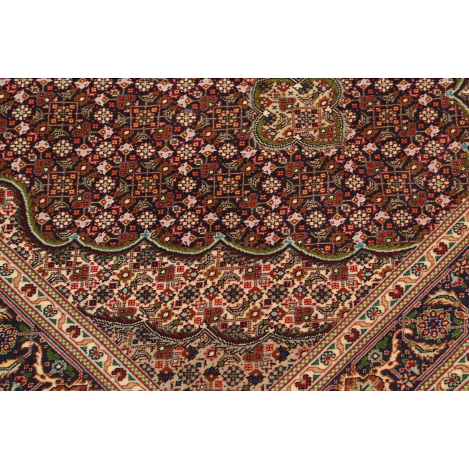 Aus dem nordiranischen Täbris, Hauptstadt der Provinz Ost-Aserbaidschan, stammt dieser Teppich. Die pulsierende Metropole besitzt eine über 500 Jahre alte Knüpftradition: In den alteingesessenen städtischen Manufakturen wurden früher große Teppiche für prächtige Paläste gefertigt. In Täbris begegnen sich verschiedene Kulturen; entsprechend groß ist hier die Vielfalt der Muster und Knüpfqualitäten. Die hochwertigsten Exemplare werden sehr fein geknüpft, mit kurzem Flor aus besonders weicher Wolle; Seidenkonturen betonen die einzelnen Motive.