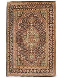 Aus dem nordiranischen Täbris, Hauptstadt der Provinz Ost-Aserbaidschan, stammt dieser Teppich. Die pulsierende Metropole besitzt eine über 500 Jahre alte Knüpftradition: In den alteingesessenen städtischen Manufakturen wurden früher große Teppiche für prächtige Paläste gefertigt. In Täbris begegnen sich verschiedene Kulturen; entsprechend groß ist hier die Vielfalt der Muster und Knüpfqualitäten. Die hochwertigsten Exemplare werden sehr fein geknüpft, mit kurzem Flor aus besonders weicher Wolle; Seidenkonturen betonen die einzelnen Motive.