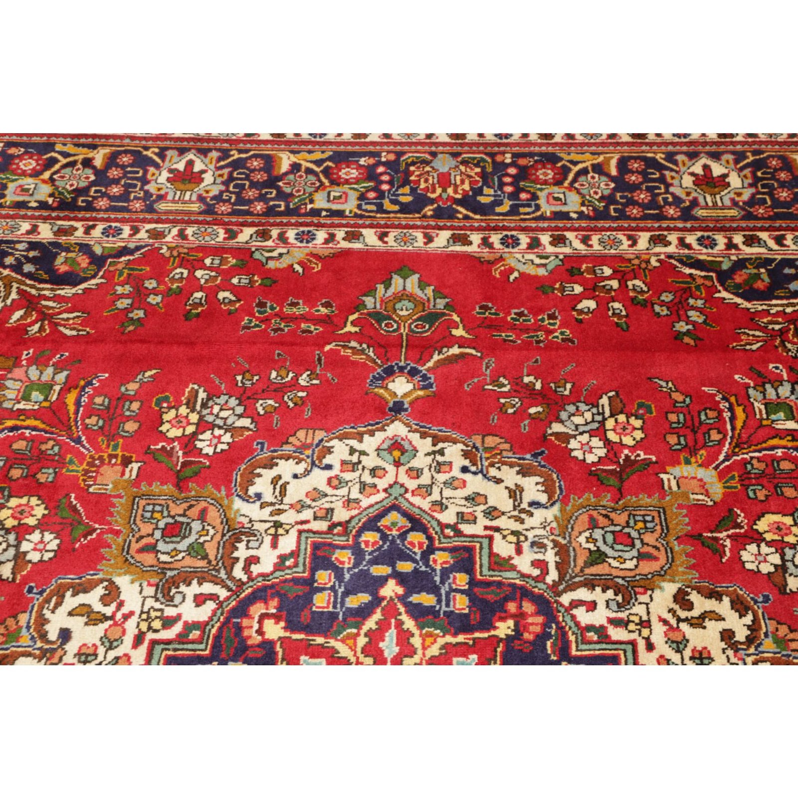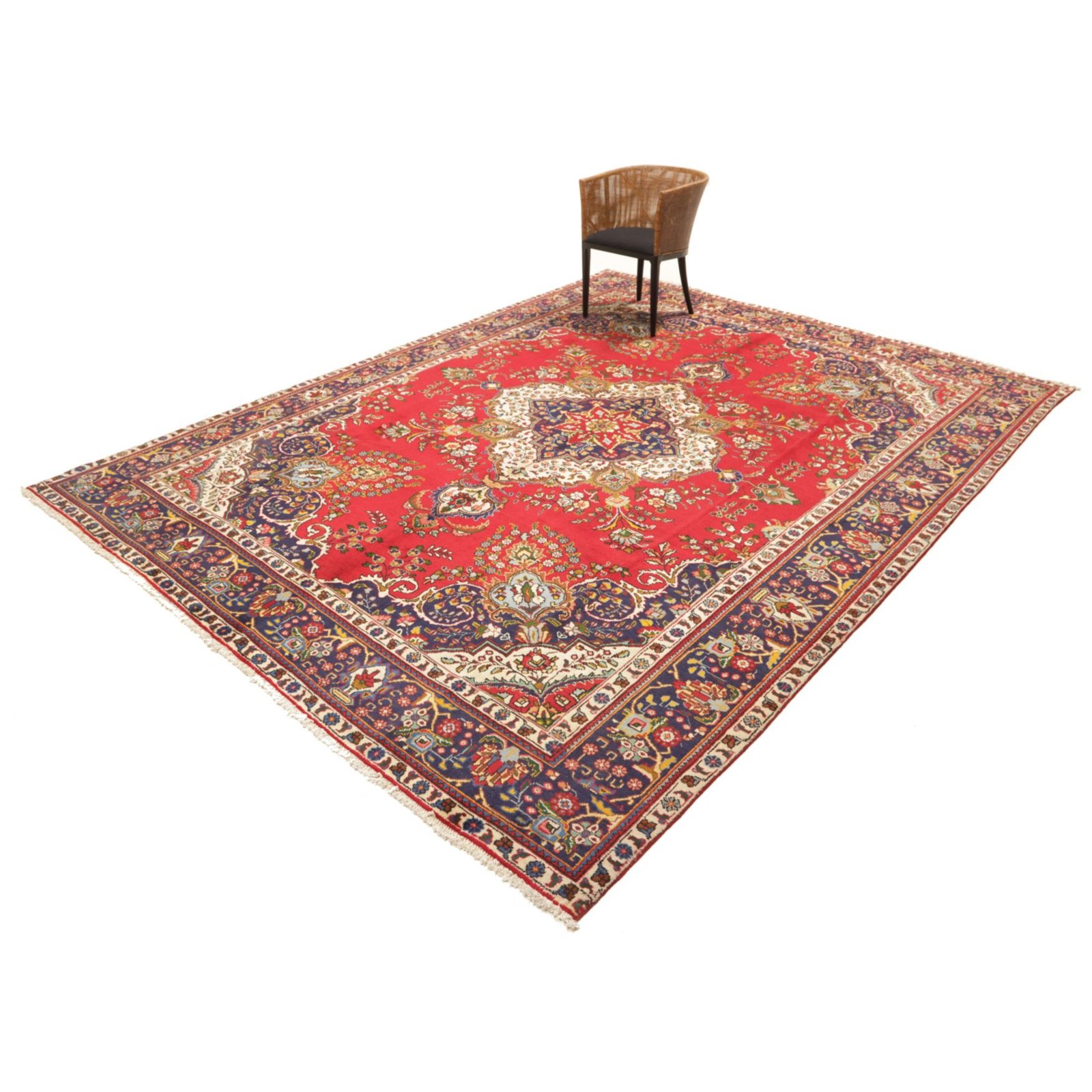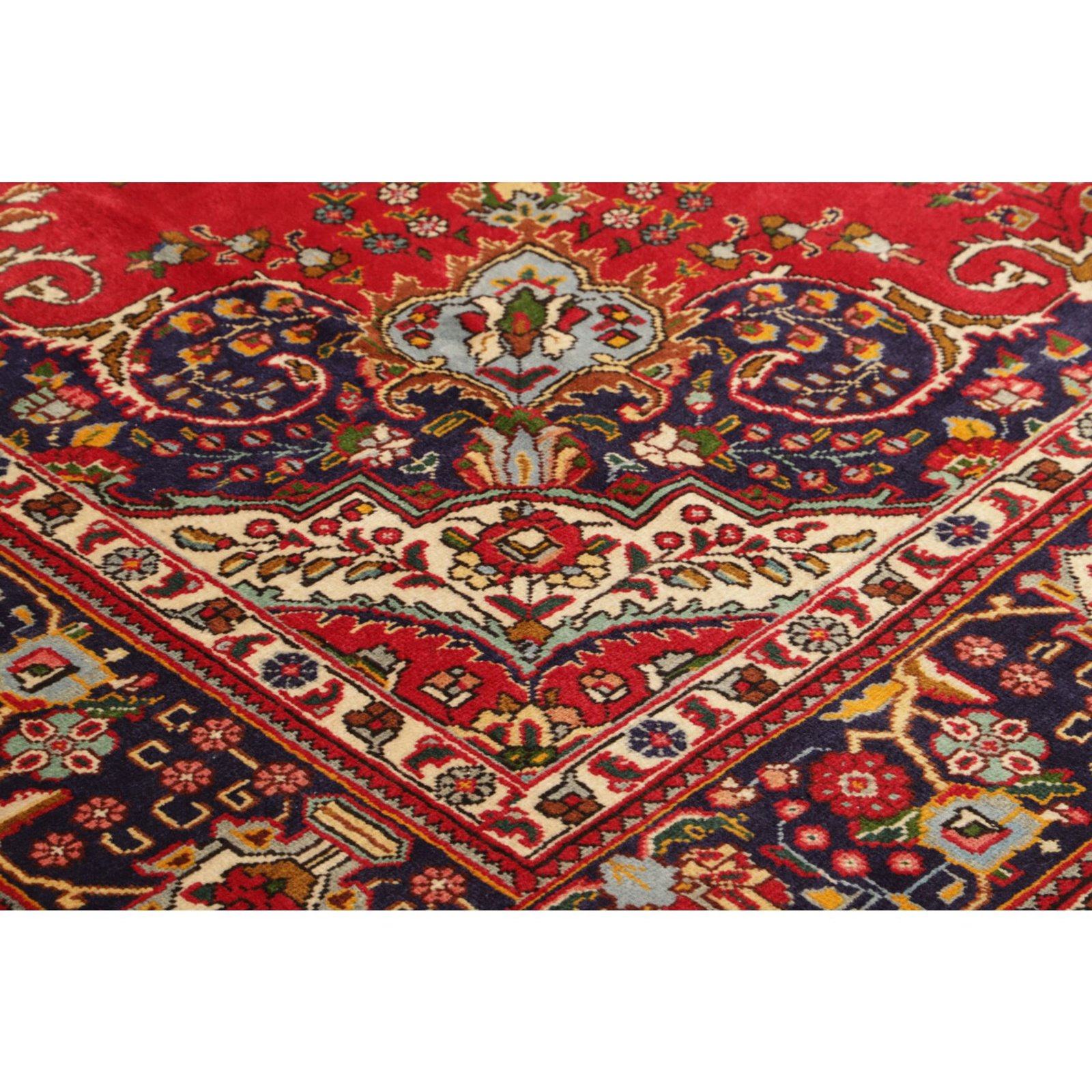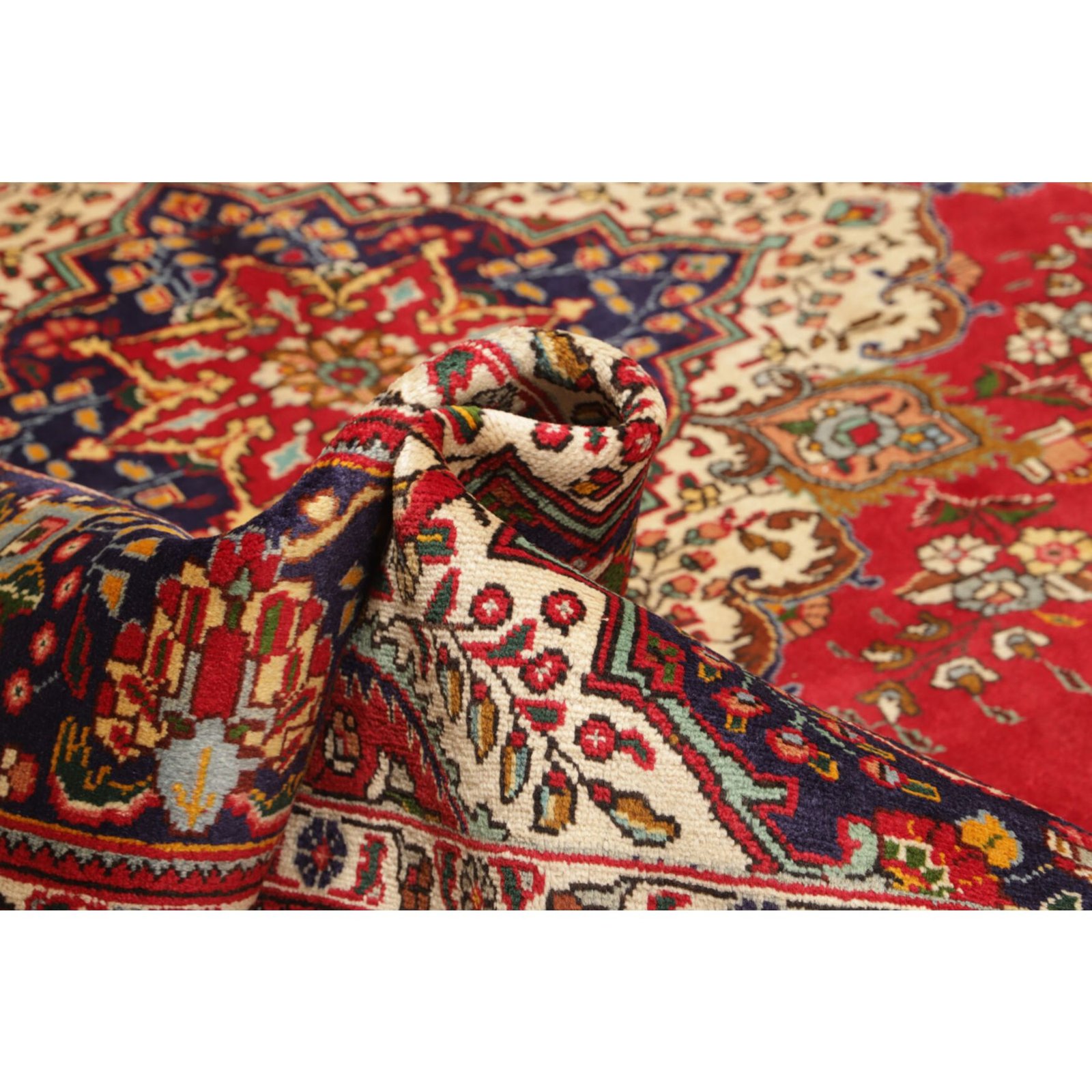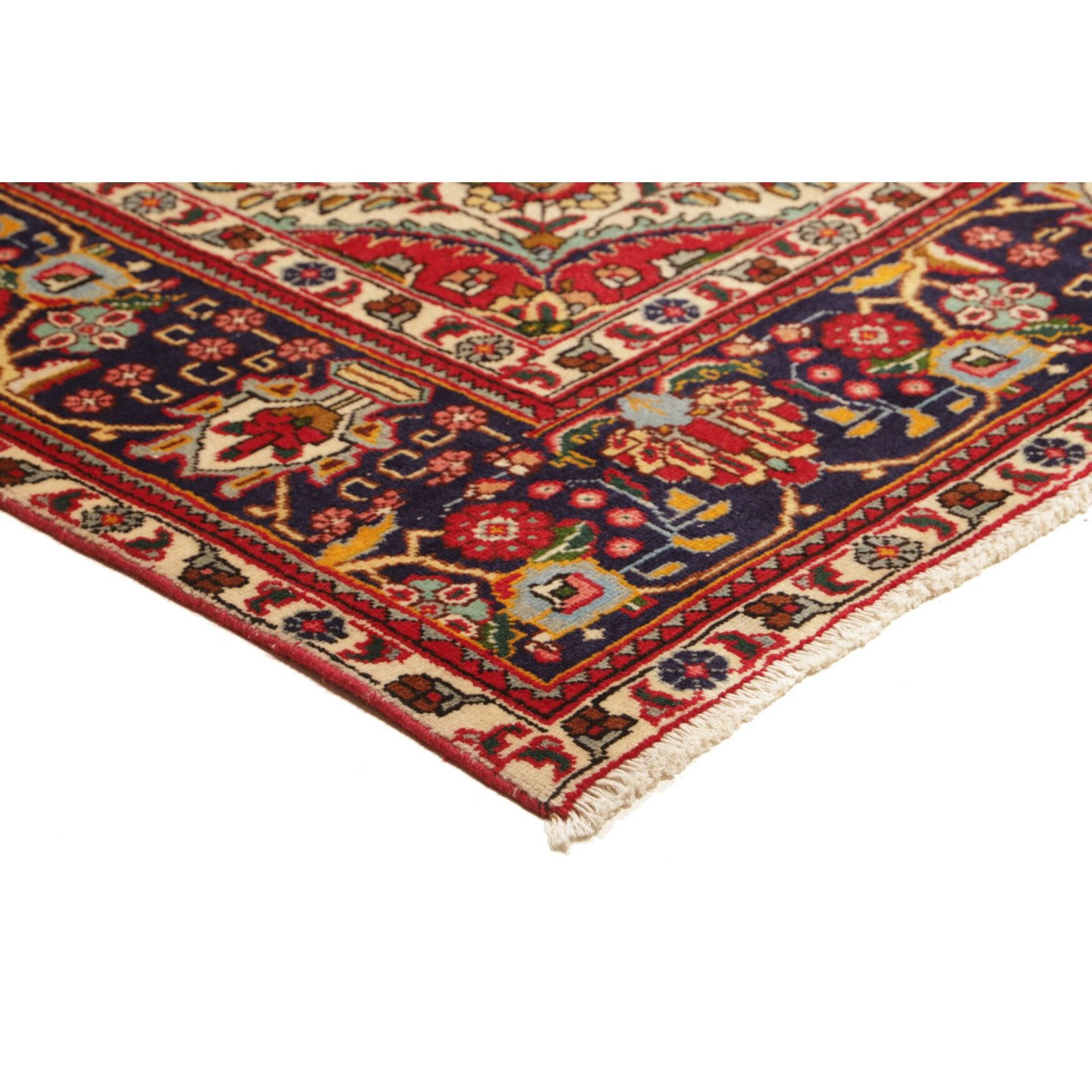 Aus dem nordiranischen Täbris, Hauptstadt der Provinz Ost-Aserbaidschan, stammt dieser Teppich. Die pulsierende Metropole besitzt eine über 500 Jahre alte Knüpftradition: In den alteingesessenen städtischen Manufakturen wurden früher große Teppiche für prächtige Paläste gefertigt. In Täbris begegnen sich verschiedene Kulturen; entsprechend groß ist hier die Vielfalt der Muster und Knüpfqualitäten. Die hochwertigsten Exemplare werden sehr fein geknüpft, mit kurzem Flor aus besonders weicher Wolle; Seidenkonturen betonen die einzelnen Motive.