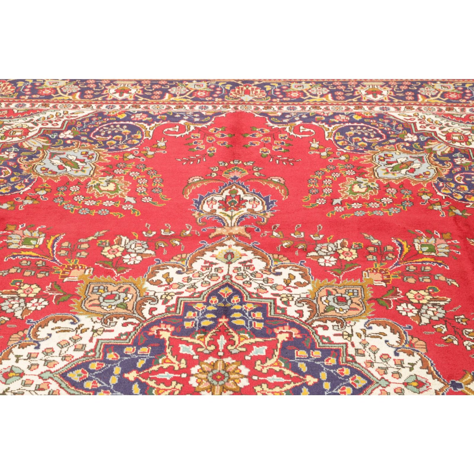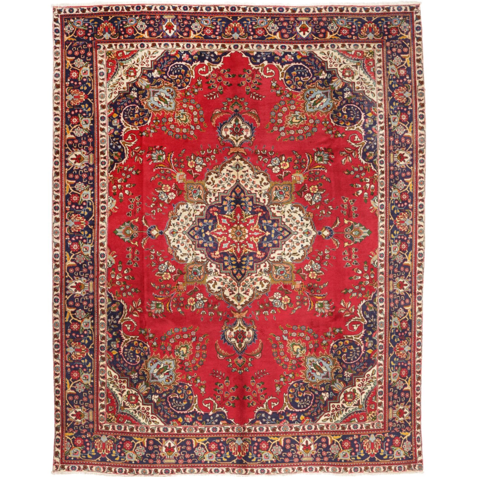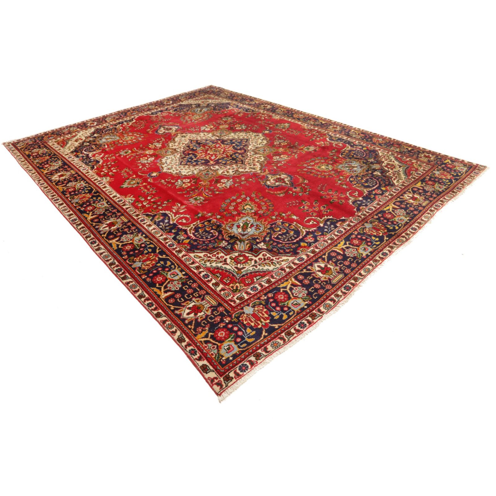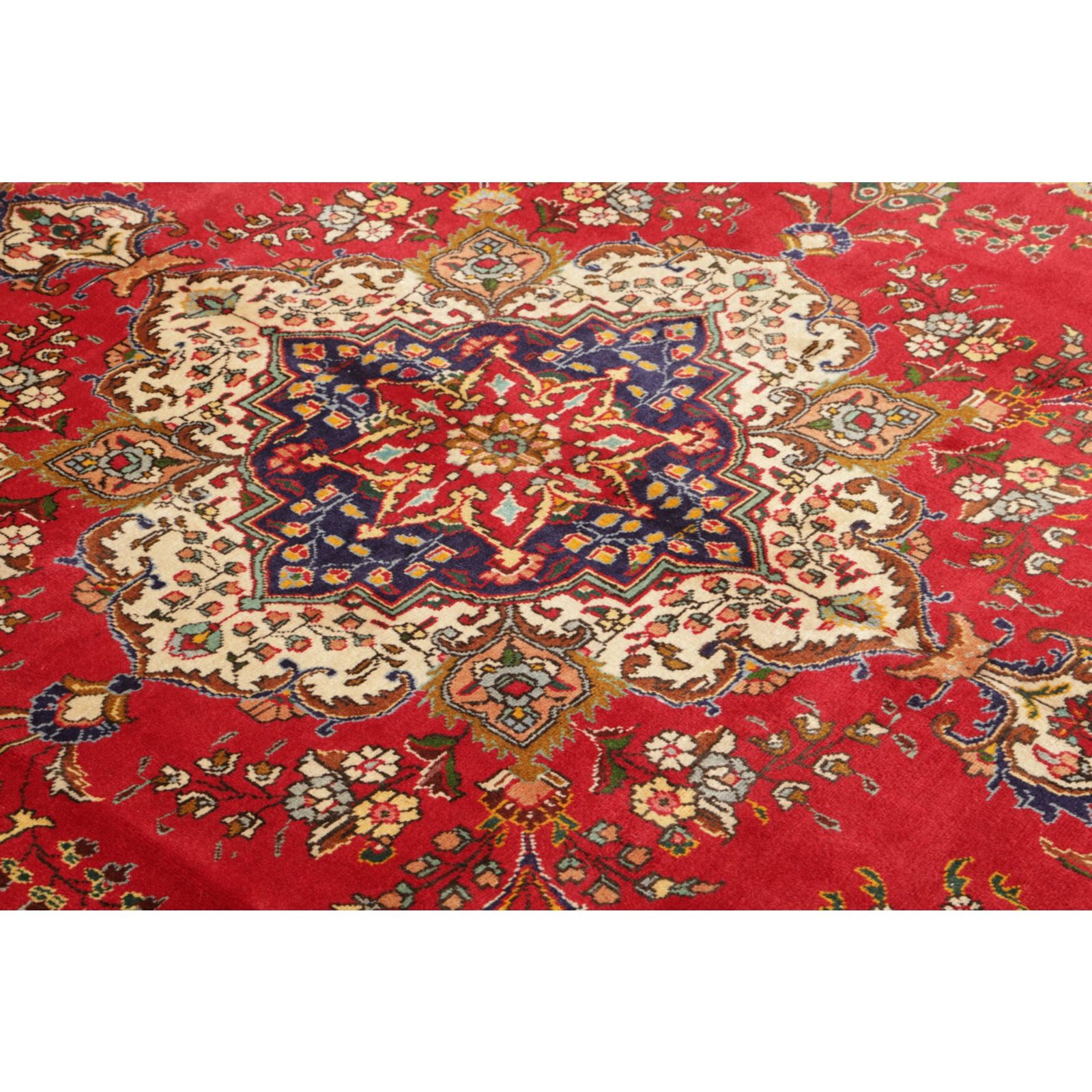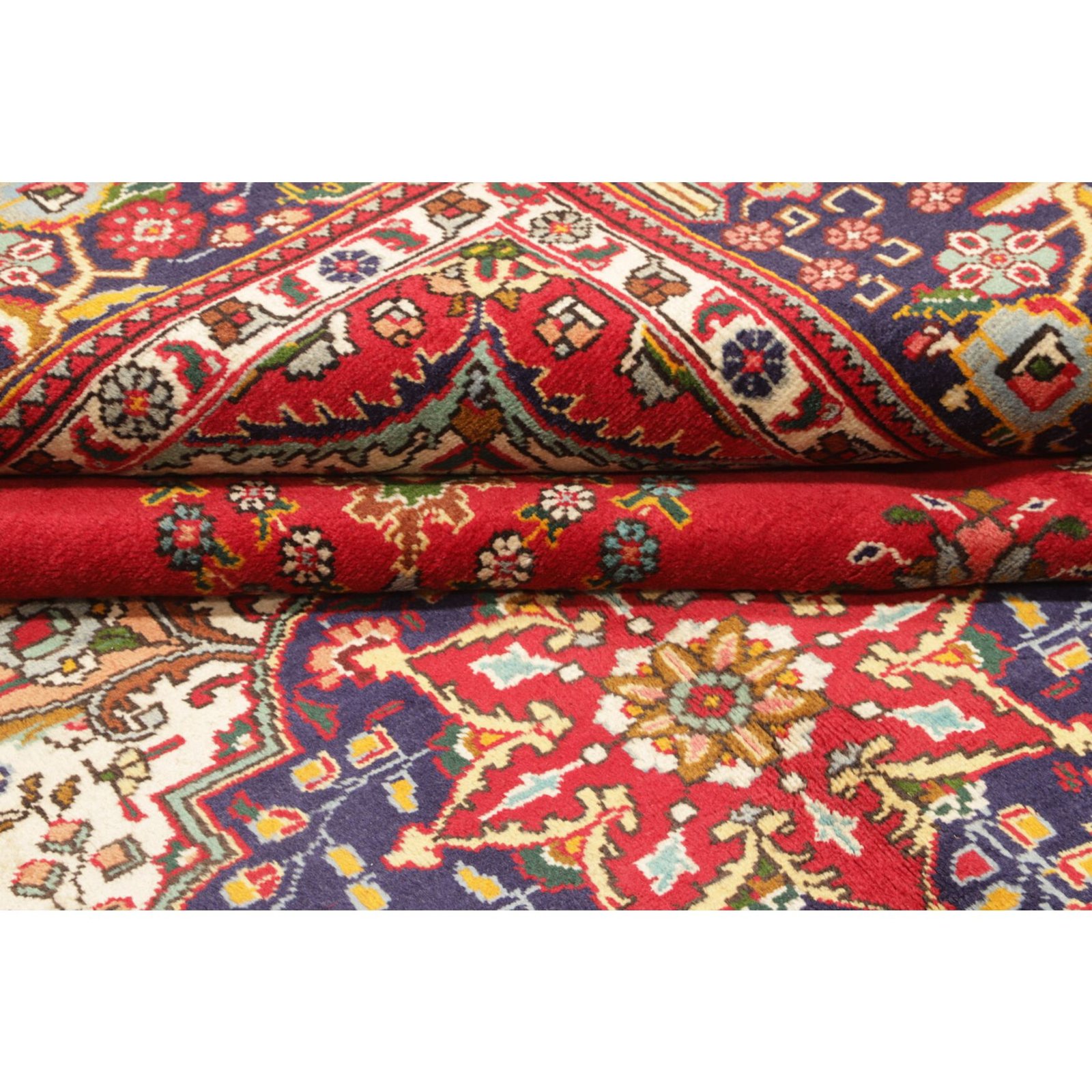Aus dem nordiranischen Täbris, Hauptstadt der Provinz Ost-Aserbaidschan, stammt dieser Teppich. Die pulsierende Metropole besitzt eine über 500 Jahre alte Knüpftradition: In den alteingesessenen städtischen Manufakturen wurden früher große Teppiche für prächtige Paläste gefertigt. In Täbris begegnen sich verschiedene Kulturen; entsprechend groß ist hier die Vielfalt der Muster und Knüpfqualitäten. Die hochwertigsten Exemplare werden sehr fein geknüpft, mit kurzem Flor aus besonders weicher Wolle; Seidenkonturen betonen die einzelnen Motive.