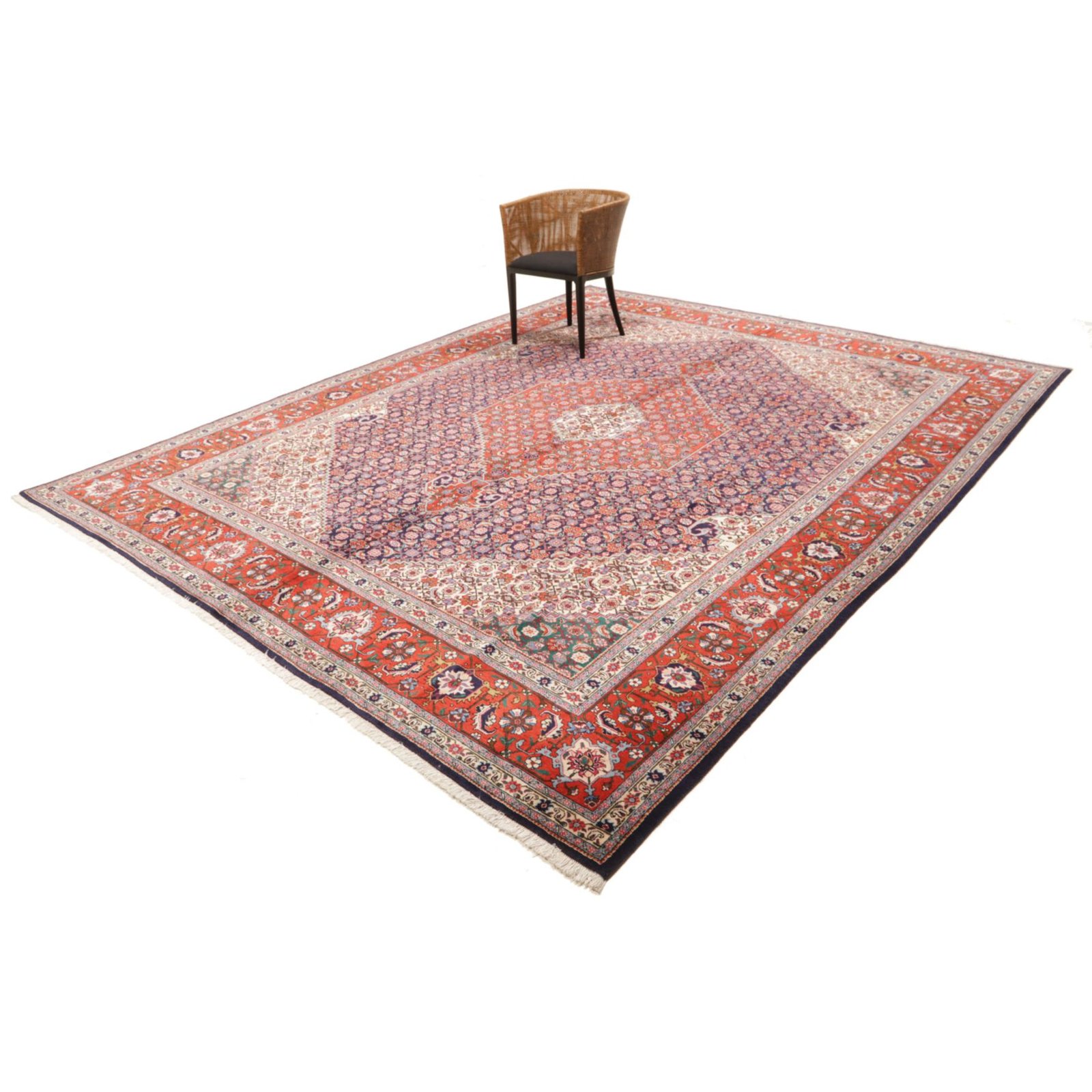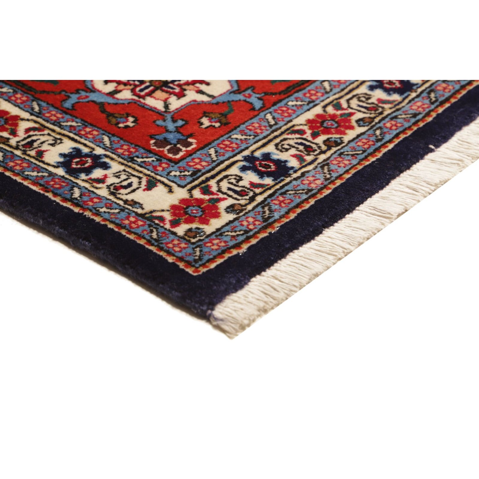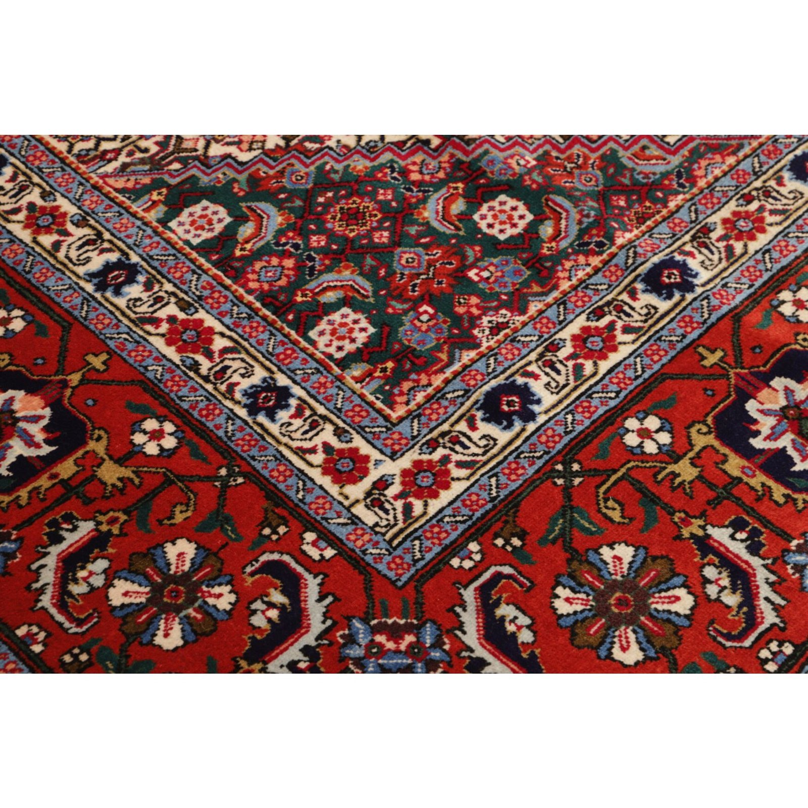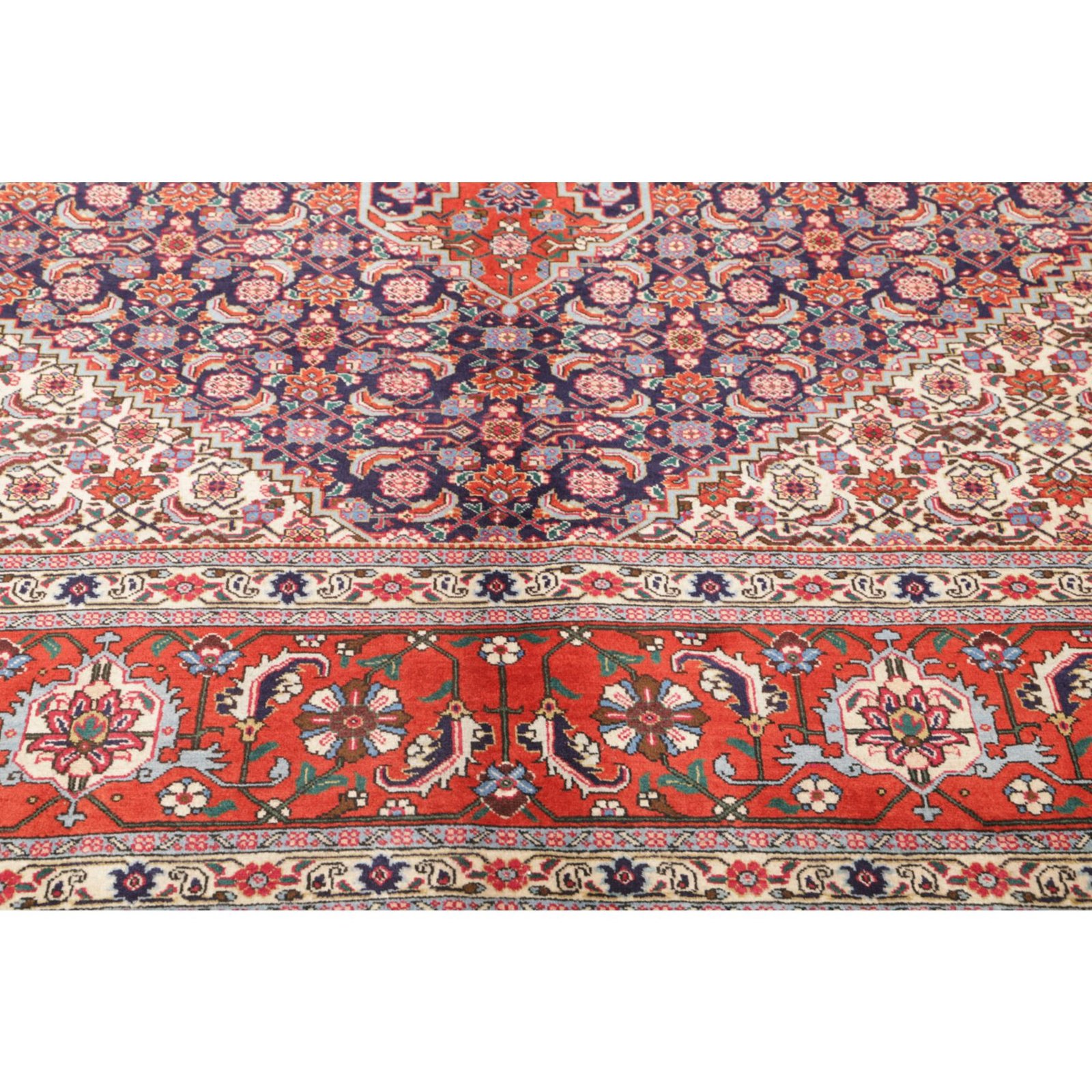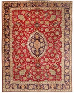 Aus dem nordiranischen Täbris, Hauptstadt der Provinz Ost-Aserbaidschan, stammt dieser Teppich. Die pulsierende Metropole besitzt eine über 500 Jahre alte Knüpftradition: In den alteingesessenen städtischen Manufakturen wurden früher große Teppiche für prächtige Paläste gefertigt. In Täbris begegnen sich verschiedene Kulturen; entsprechend groß ist hier die Vielfalt der Muster und Knüpfqualitäten. Die hochwertigsten Exemplare werden sehr fein geknüpft, mit kurzem Flor aus besonders weicher Wolle; Seidenkonturen betonen die einzelnen Motive.