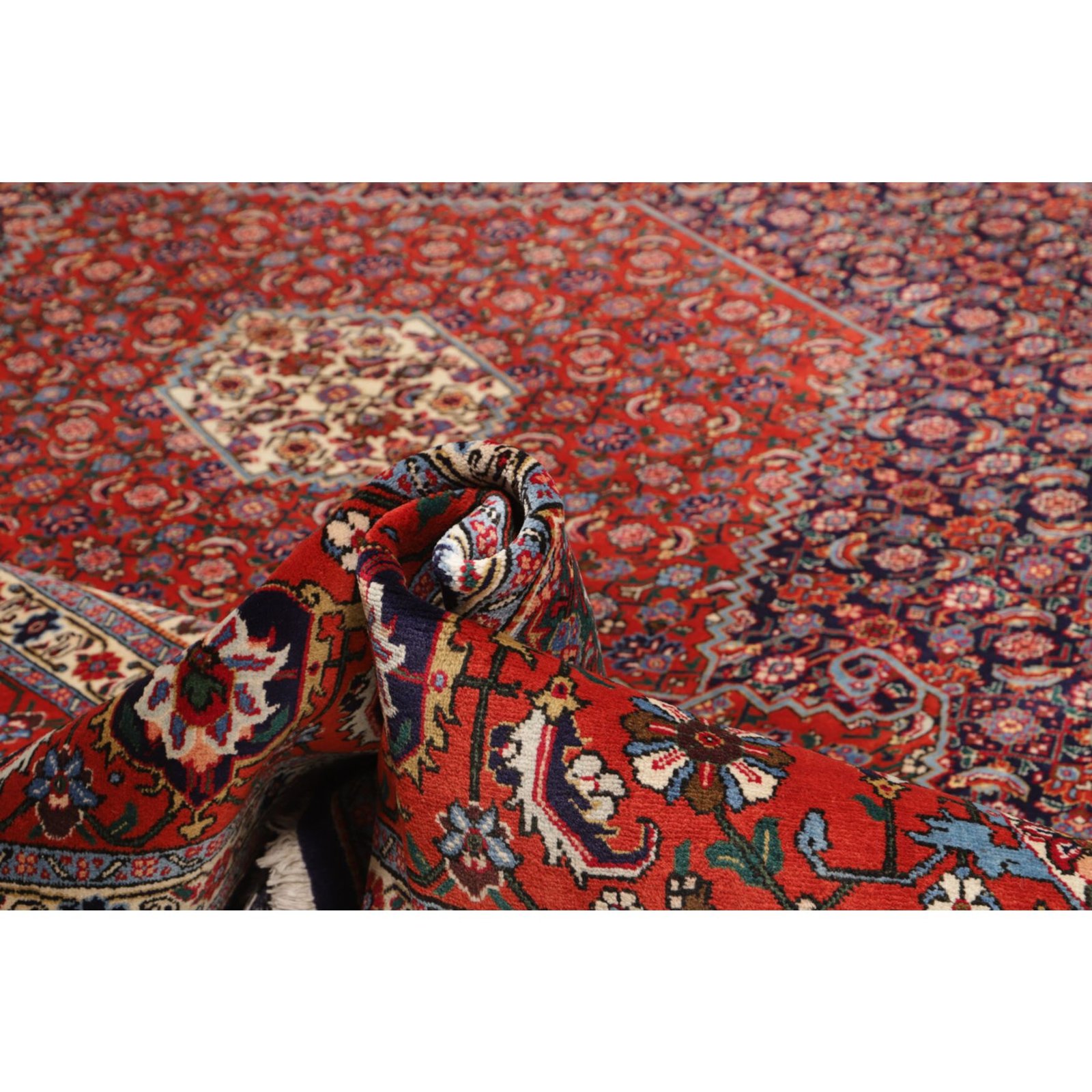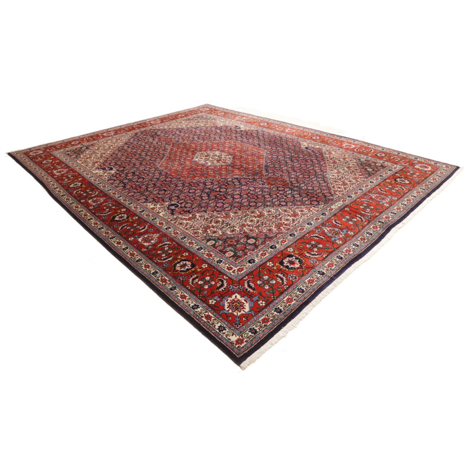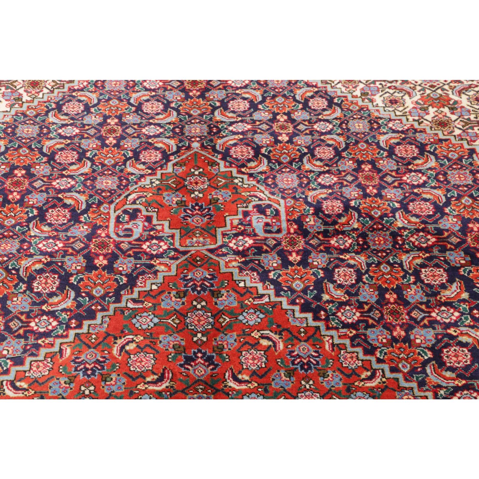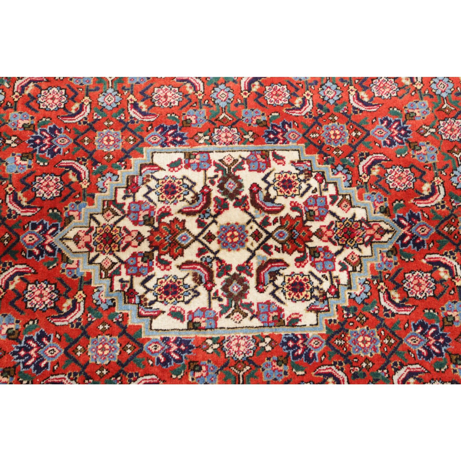 Aus dem nordiranischen Täbris, Hauptstadt der Provinz Ost-Aserbaidschan, stammt dieser Teppich. Die pulsierende Metropole besitzt eine über 500 Jahre alte Knüpftradition: In den alteingesessenen städtischen Manufakturen wurden früher große Teppiche für prächtige Paläste gefertigt. In Täbris begegnen sich verschiedene Kulturen; entsprechend groß ist hier die Vielfalt der Muster und Knüpfqualitäten. Die hochwertigsten Exemplare werden sehr fein geknüpft, mit kurzem Flor aus besonders weicher Wolle; Seidenkonturen betonen die einzelnen Motive.
