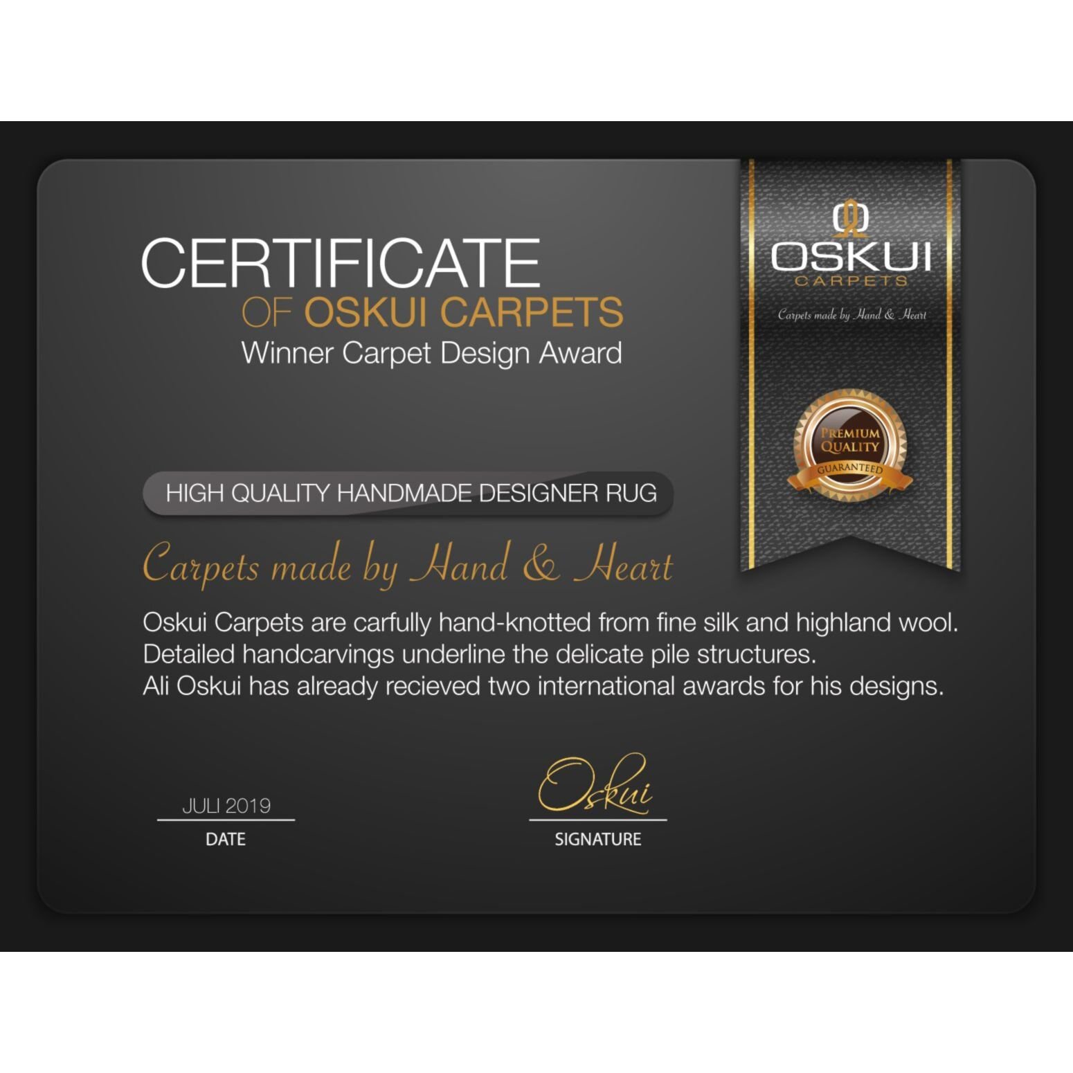 Für seine Teppichdesigns hat Oskui mehrere internationale Preise erhalten, unter anderem den renommierten Carpet Design Award.