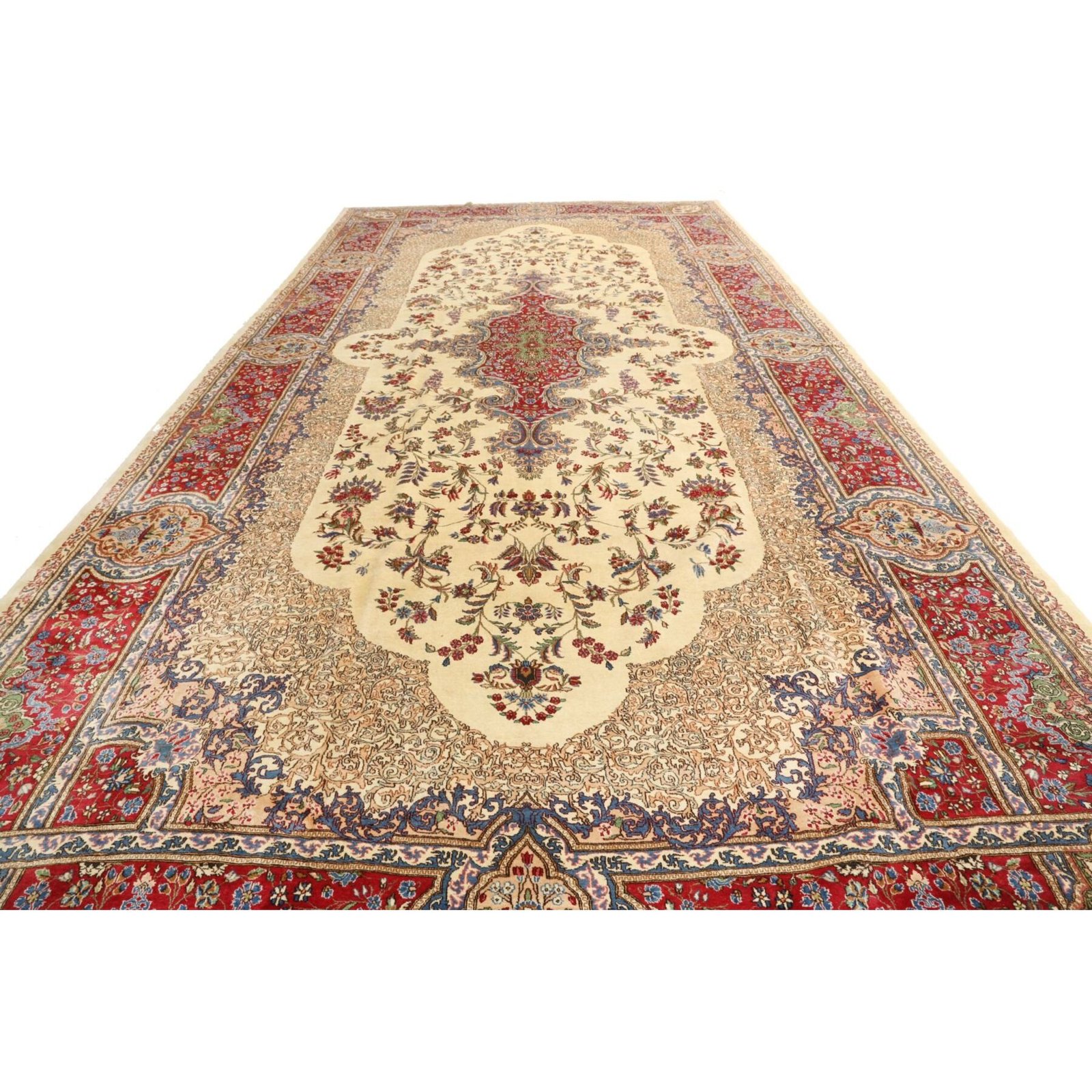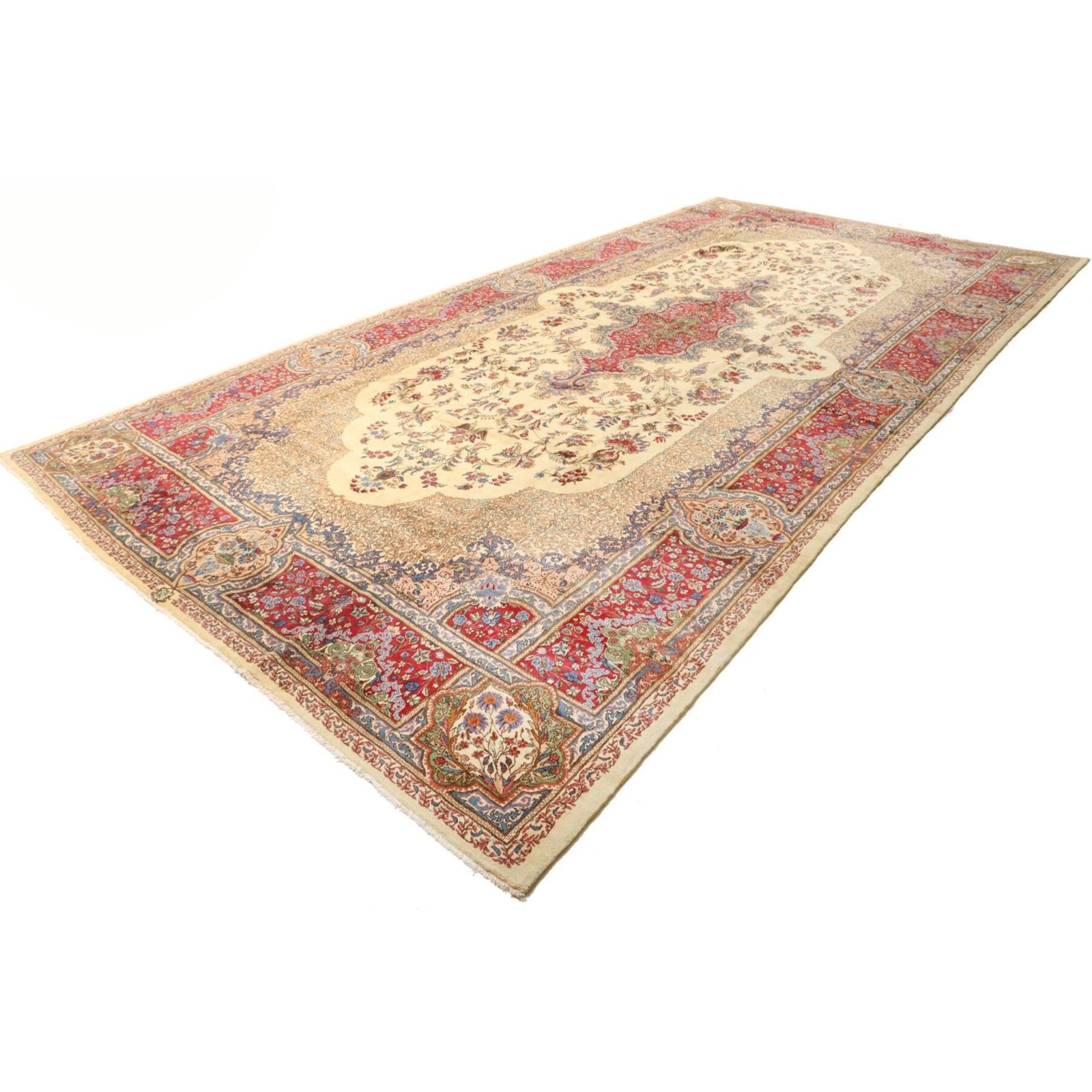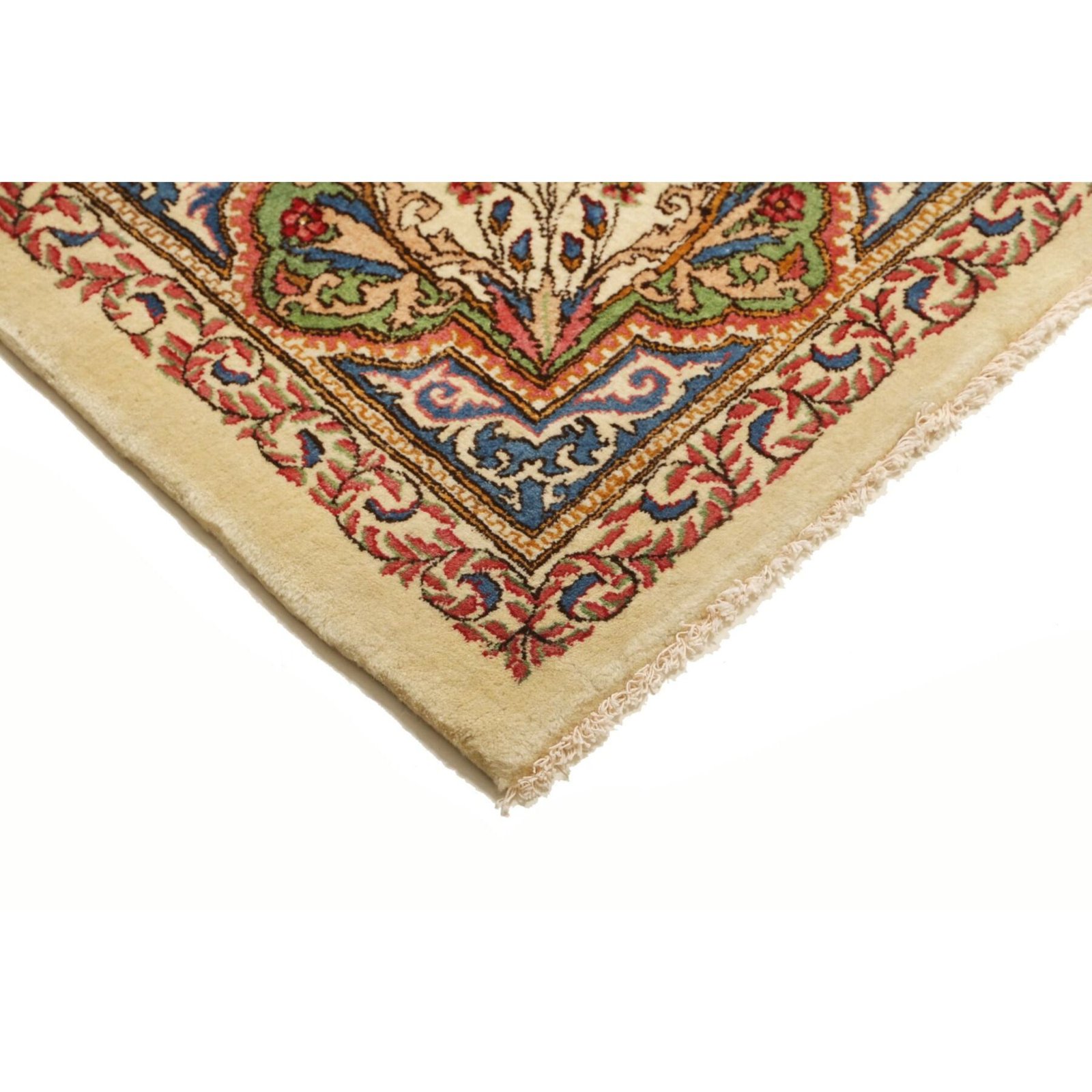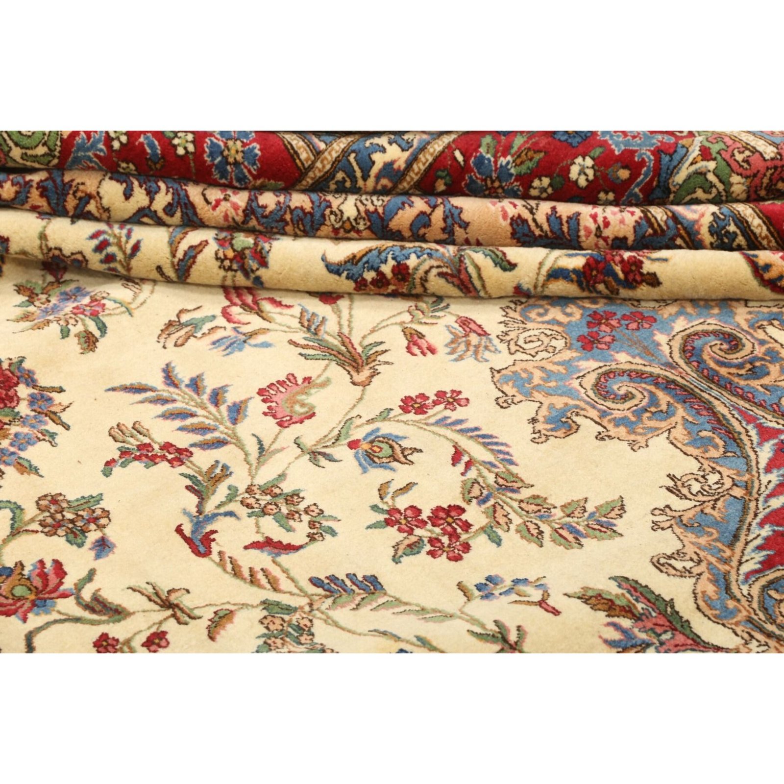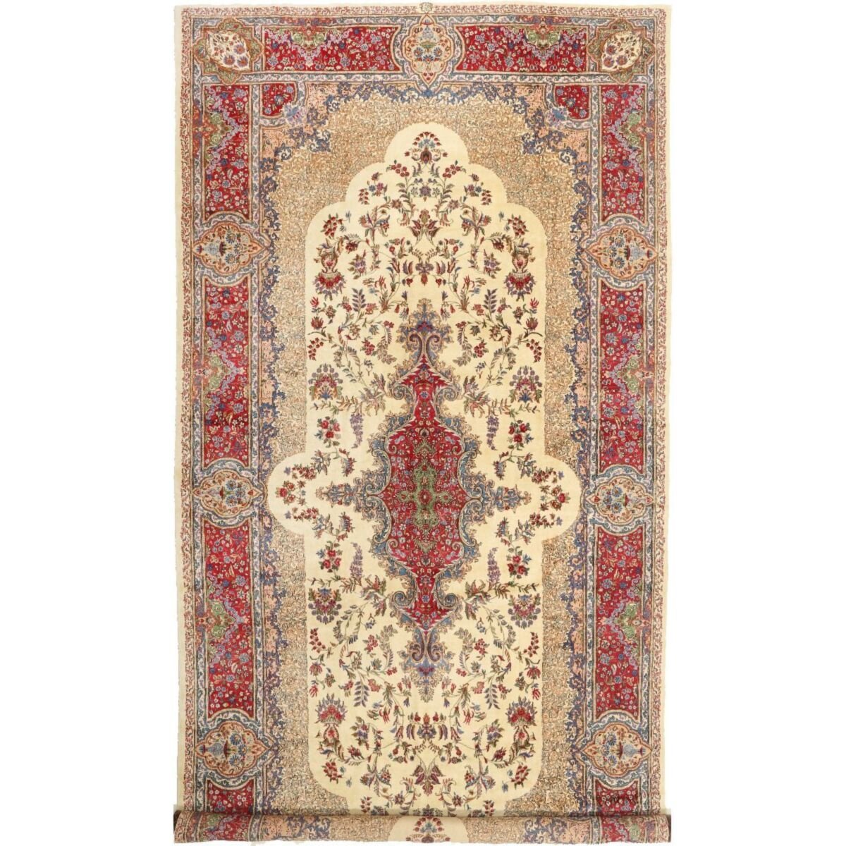 Die ersten Kerman-Teppiche wurden in Kerman, einer iranischen Stadt im Südosten des Landes, vor über tausend Jahren hergestellt. Kerman-Teppiche wurden auf der ganzen Welt populär gemacht, als Marco Polo ihre unglaubliche Handwerkskunst und ihr unverwechselbares Design bemerkte. Sie zeichnen sich normalerweise durch ein florales oder architektonisches Thema in der Bordüre, mit einem Medaillon in der Mitte des Teppich aus.