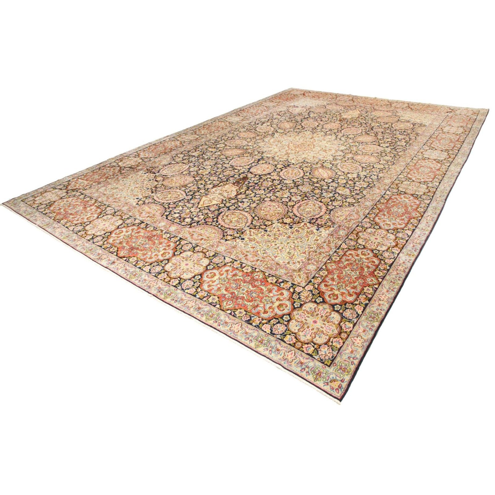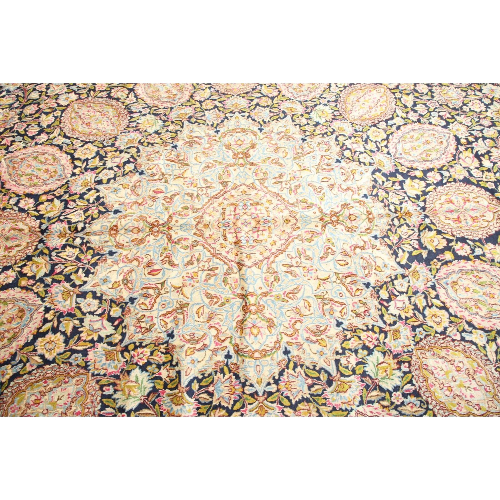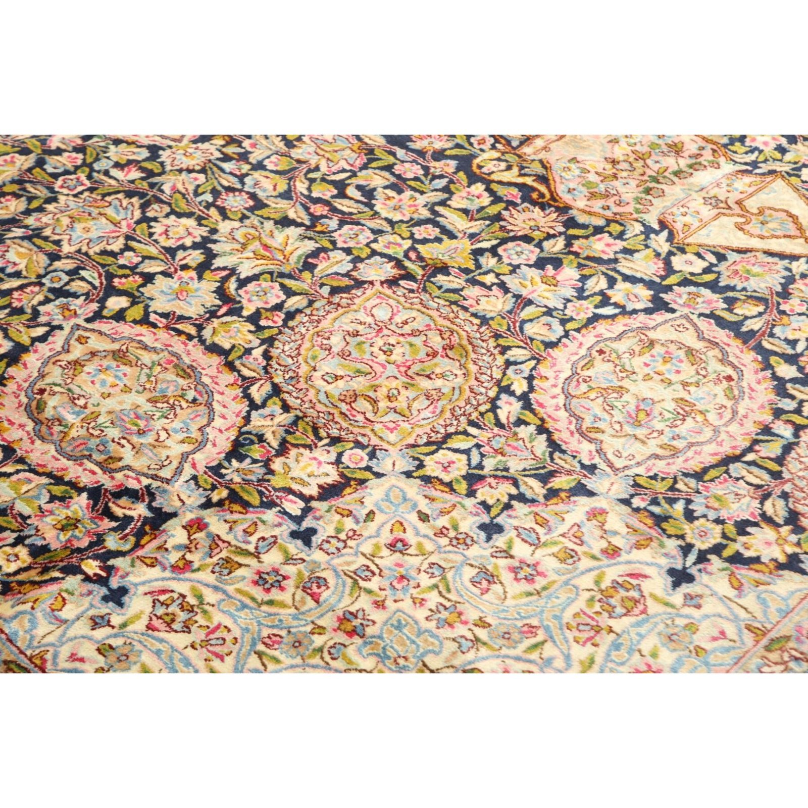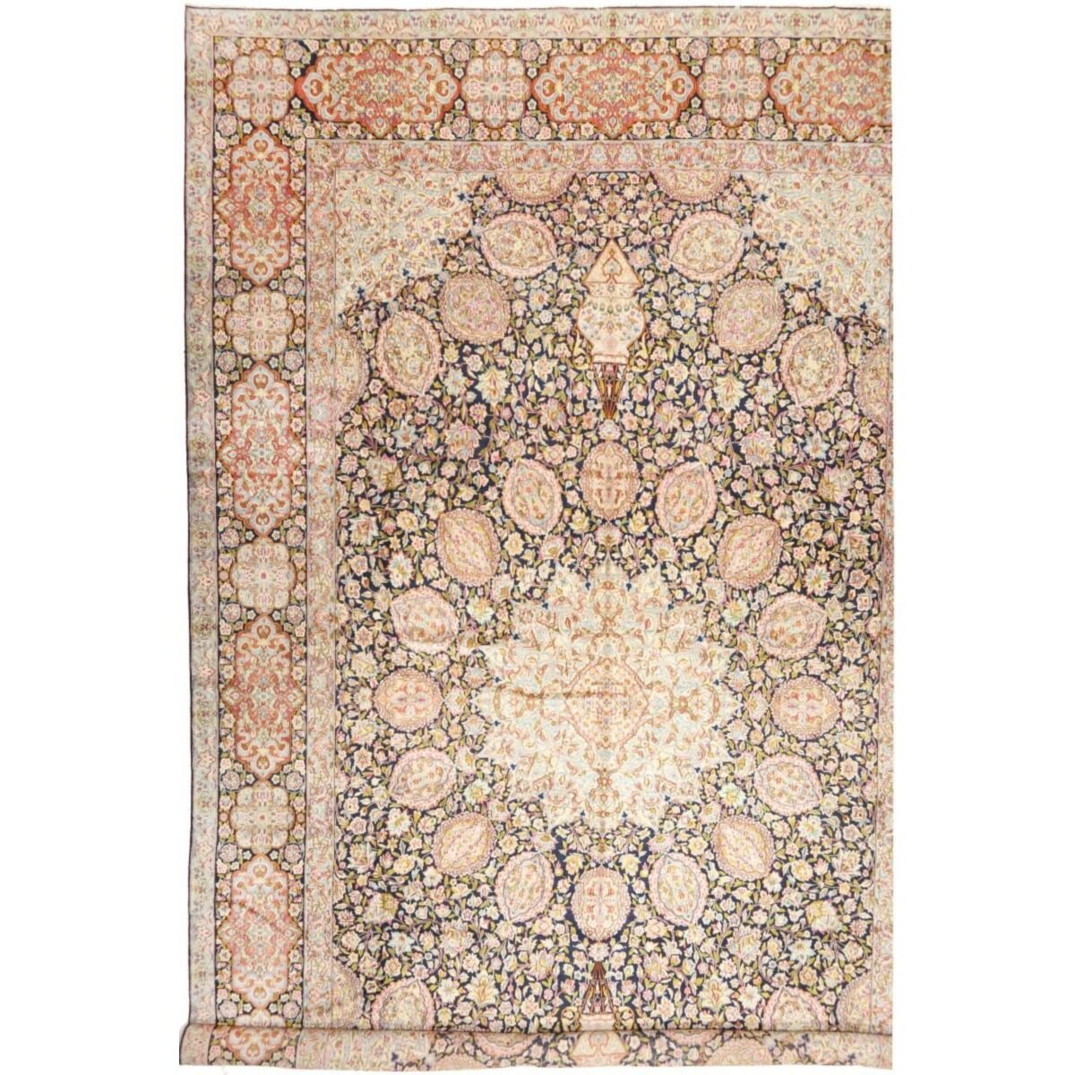 Die ersten Kerman-Teppiche wurden in Kerman, einer iranischen Stadt im Südosten des Landes, vor über tausend Jahren hergestellt. Kerman-Teppiche wurden auf der ganzen Welt populär gemacht, als Marco Polo ihre unglaubliche Handwerkskunst und ihr unverwechselbares Design bemerkte. Sie zeichnen sich normalerweise durch ein florales oder architektonisches Thema in der Bordüre, mit einem Medaillon in der Mitte des Teppich aus.
