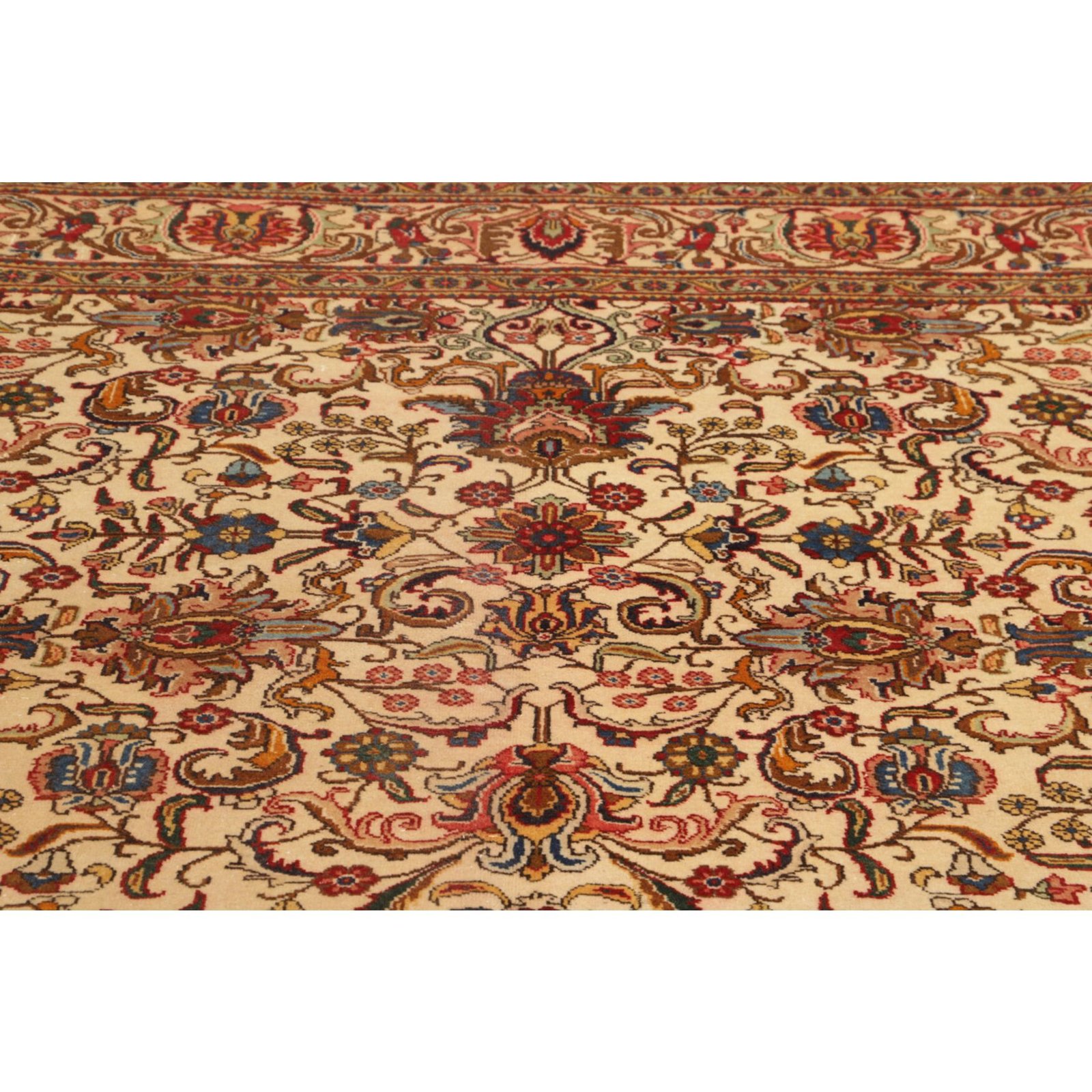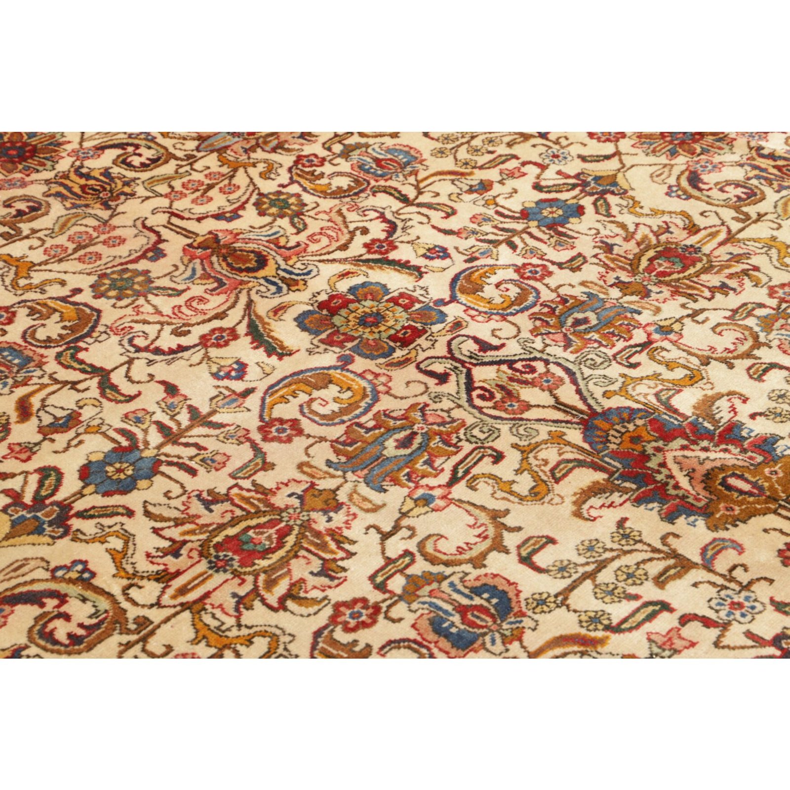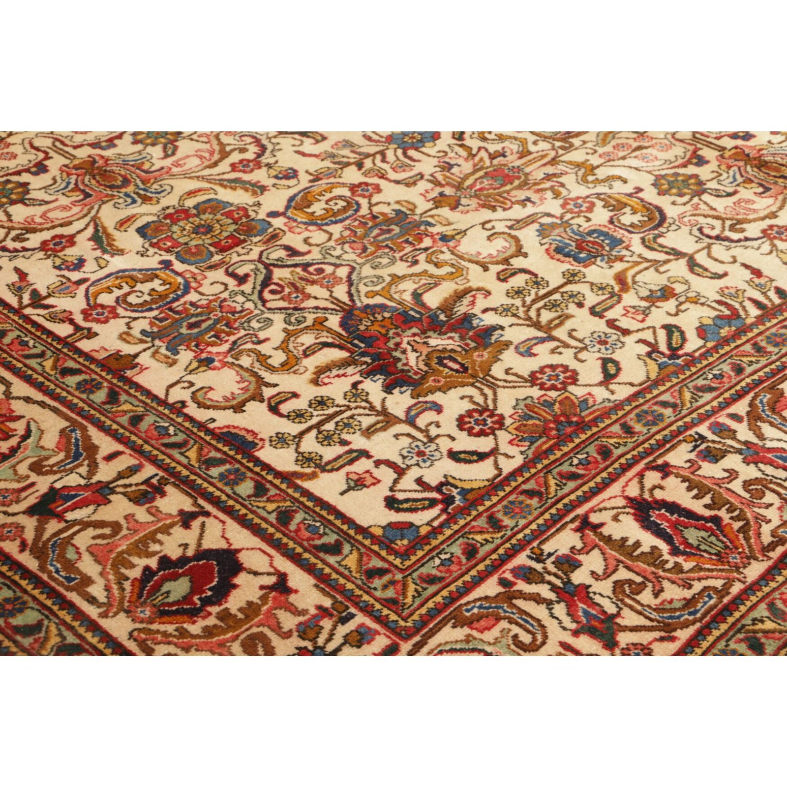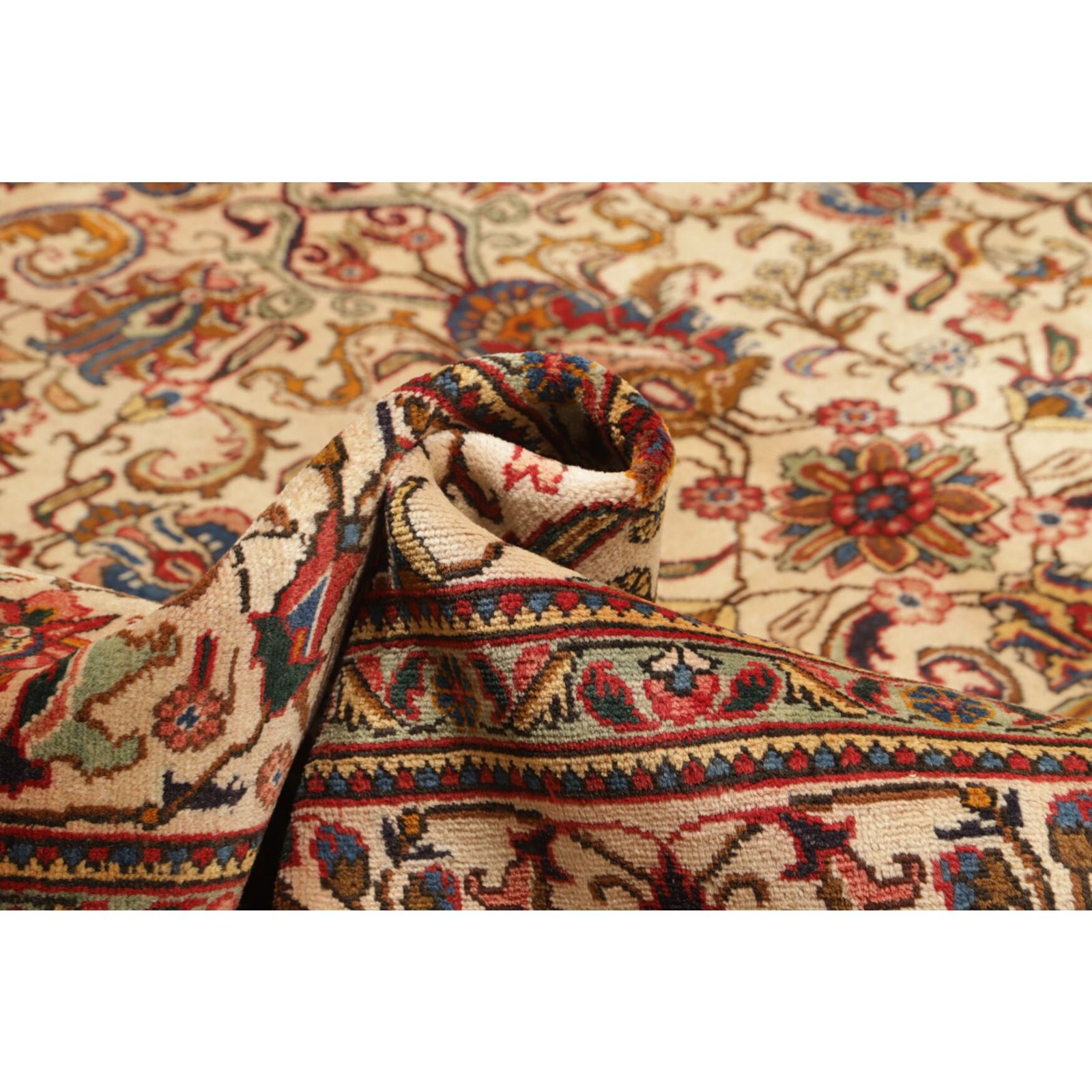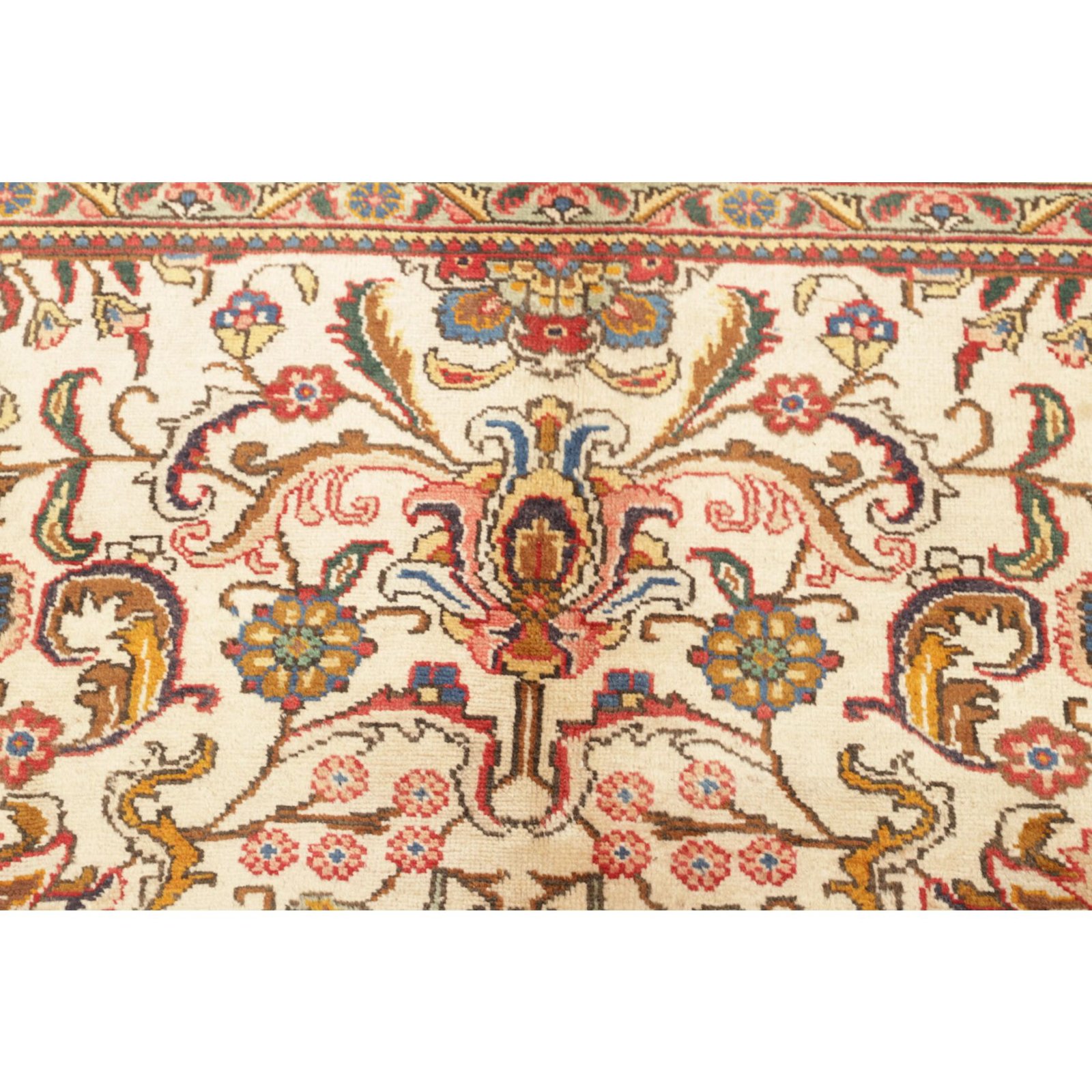 Aus dem nordiranischen Täbris, Hauptstadt der Provinz Ost-Aserbaidschan, stammt dieser Teppich. Die pulsierende Metropole besitzt eine über 500 Jahre alte Knüpftradition: In den alteingesessenen städtischen Manufakturen wurden früher große Teppiche für prächtige Paläste gefertigt. In Täbris begegnen sich verschiedene Kulturen; entsprechend groß ist hier die Vielfalt der Muster und Knüpfqualitäten. Die hochwertigsten Exemplare werden sehr fein geknüpft, mit kurzem Flor aus besonders weicher Wolle; Seidenkonturen betonen die einzelnen Motive.