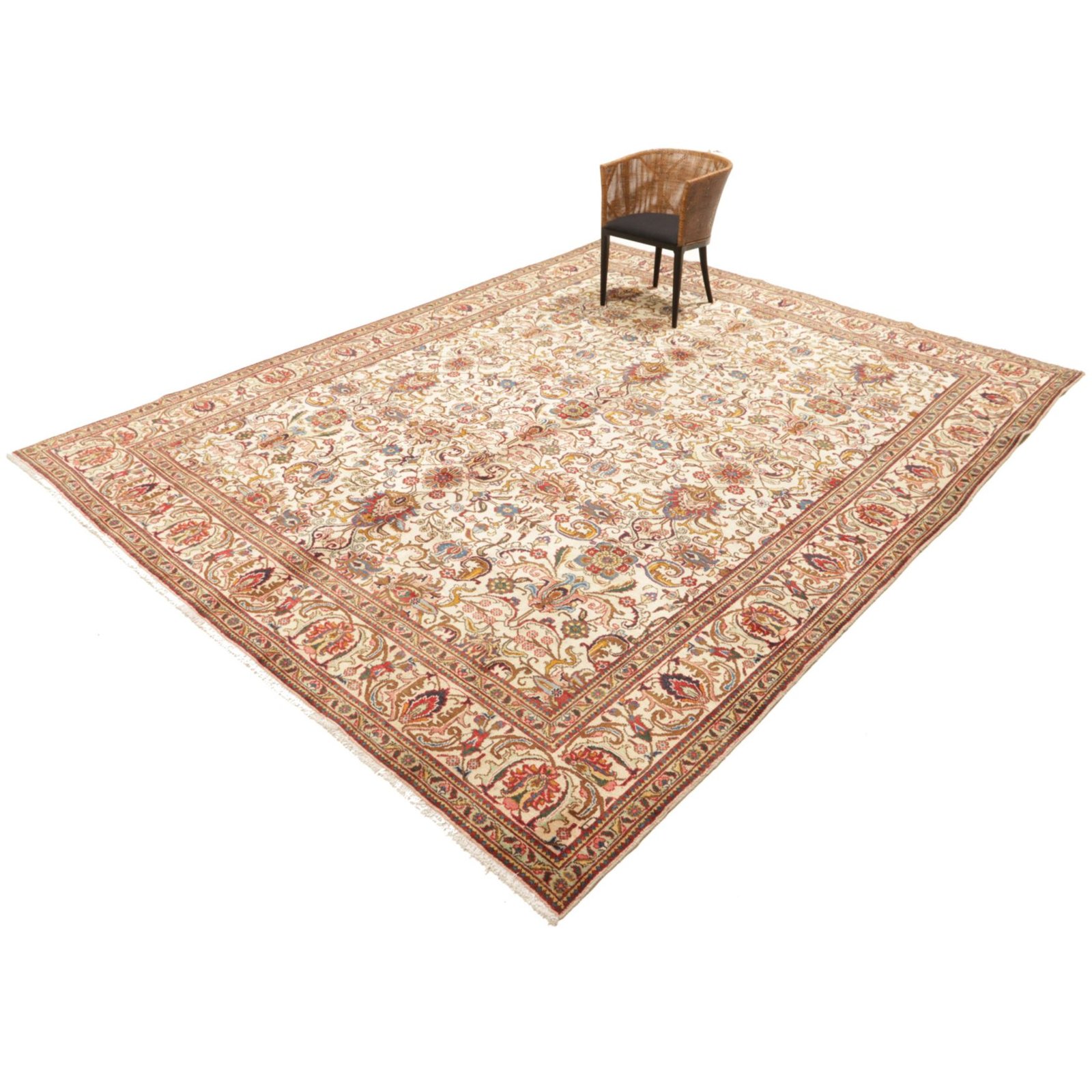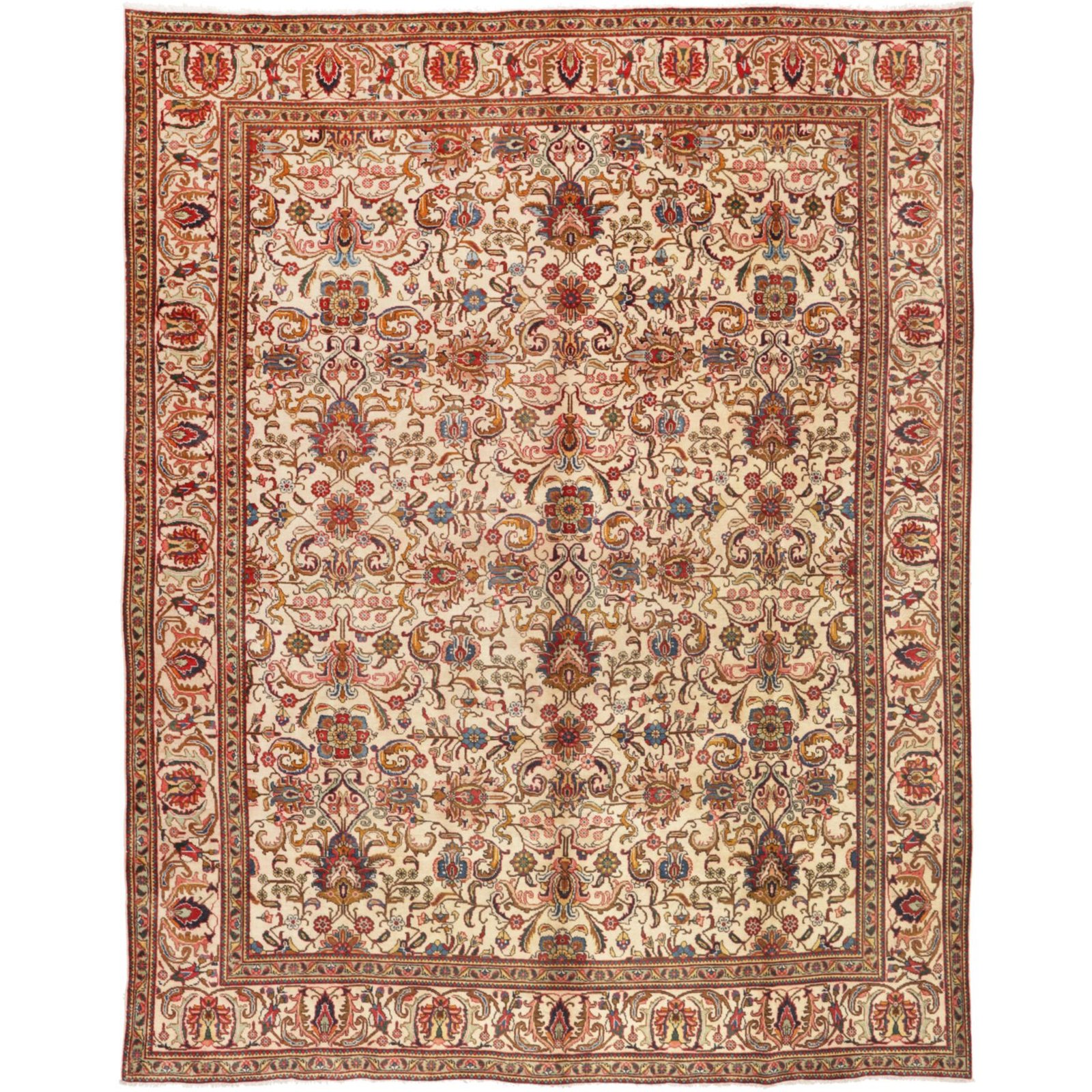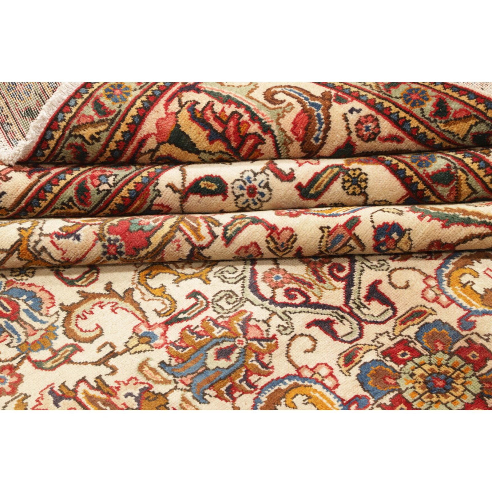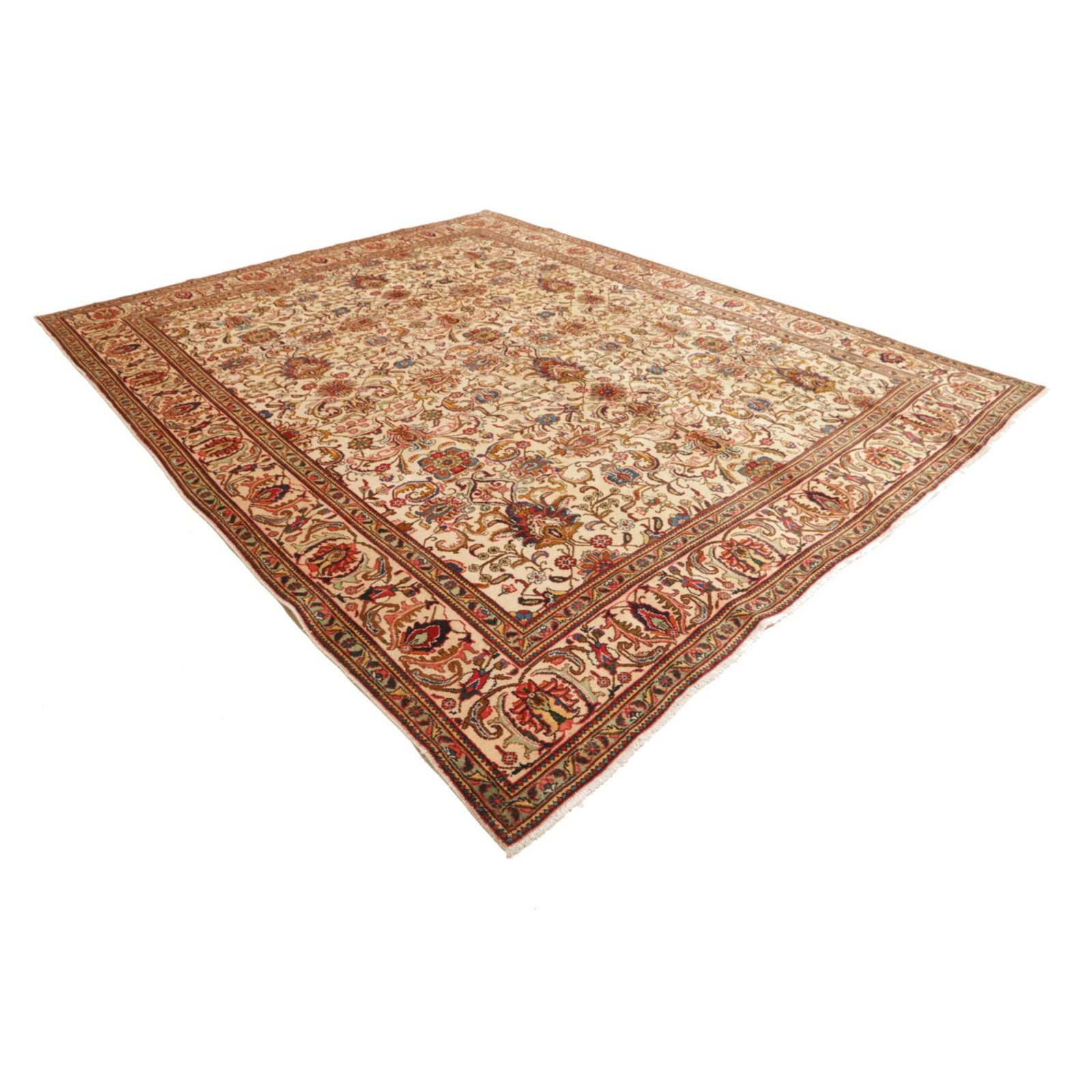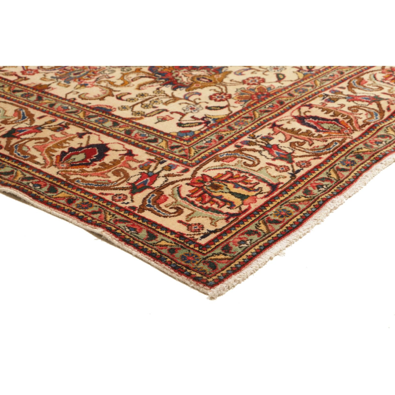 Aus dem nordiranischen Täbris, Hauptstadt der Provinz Ost-Aserbaidschan, stammt dieser Teppich. Die pulsierende Metropole besitzt eine über 500 Jahre alte Knüpftradition: In den alteingesessenen städtischen Manufakturen wurden früher große Teppiche für prächtige Paläste gefertigt. In Täbris begegnen sich verschiedene Kulturen; entsprechend groß ist hier die Vielfalt der Muster und Knüpfqualitäten. Die hochwertigsten Exemplare werden sehr fein geknüpft, mit kurzem Flor aus besonders weicher Wolle; Seidenkonturen betonen die einzelnen Motive.